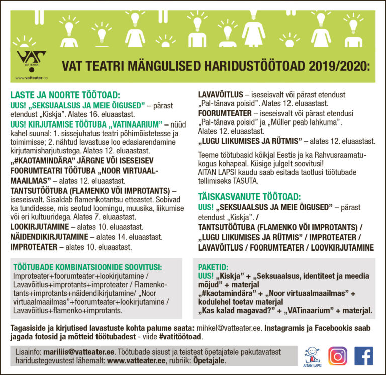 Kõigest uuest, aga ka juba eelmisel hooajal kavas olnud lavastustest ja töötubadest lähemalt meie kodulehelt www.vatteater.ee.