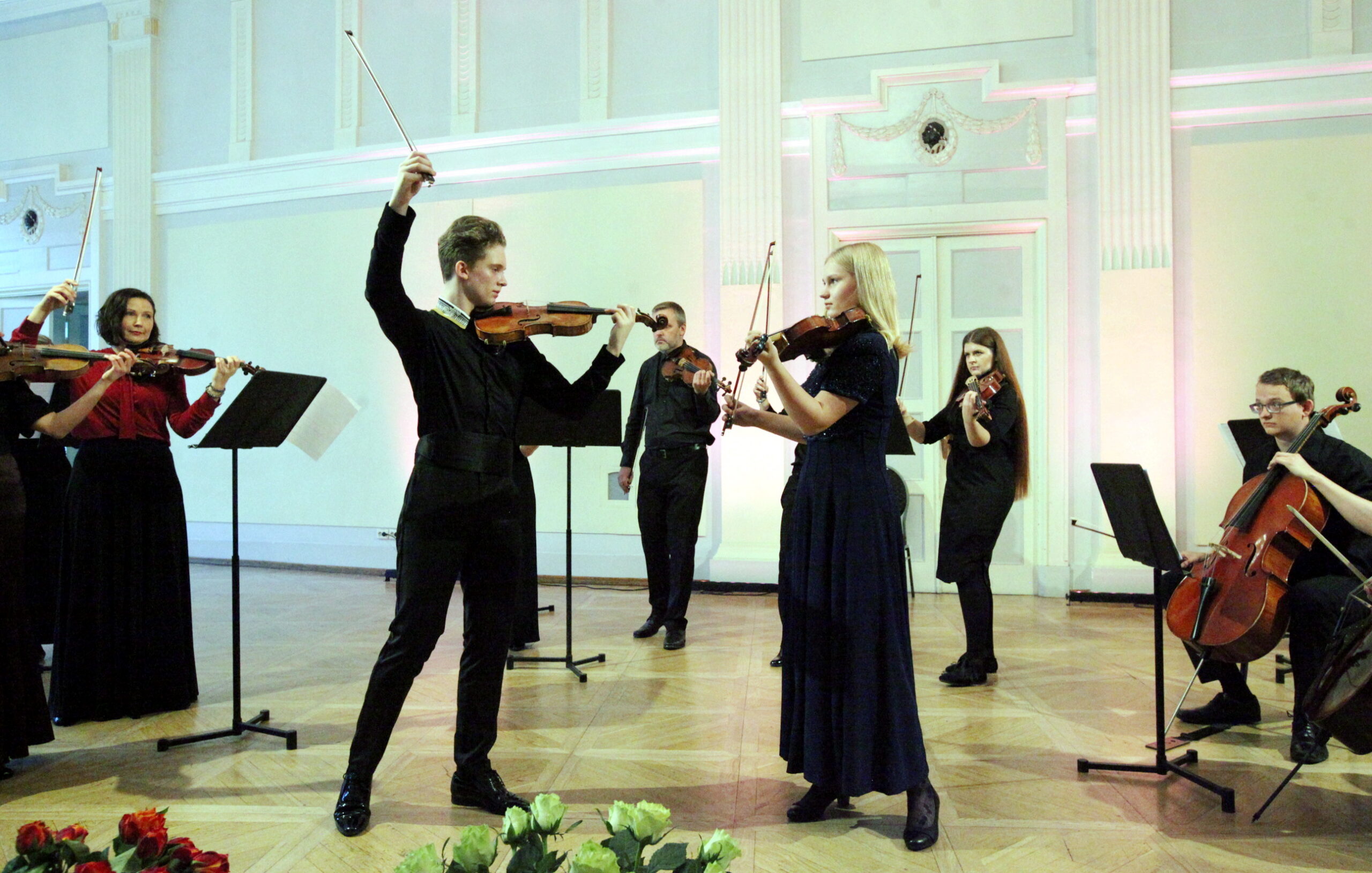 Ingmar Kiviloo ja Karoliina Kuppart musitseerimas koos ERSO kammerkoosseisuga 13. oktoobril Mustpeade majas. Foto: Viktor Burkivski