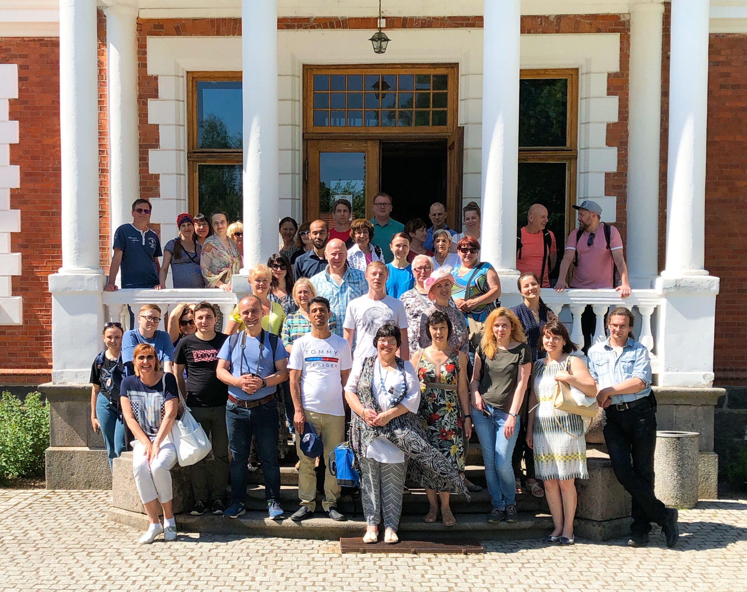 Tallinna eesti keele maja õppijad külastavad pärast kursuse lõppu kauneid kohti Eestis. Foto on tehtud Olustveres, kus tutvuti lossi ja pargiga, käidi keraamika- ja klaasikojas, küpsetati leiba, vaadati Voldemar Luha puunikerdiste ekspositsiooni ning Ilmar Tilga topiste kogu.
