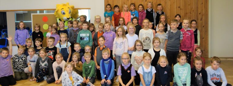 Lugemispesade kokkutulekust osavõtjate ühisfotol on koos lastega ka üllatuskülaline Lõvi Leo. Fotod: Helen Nigol