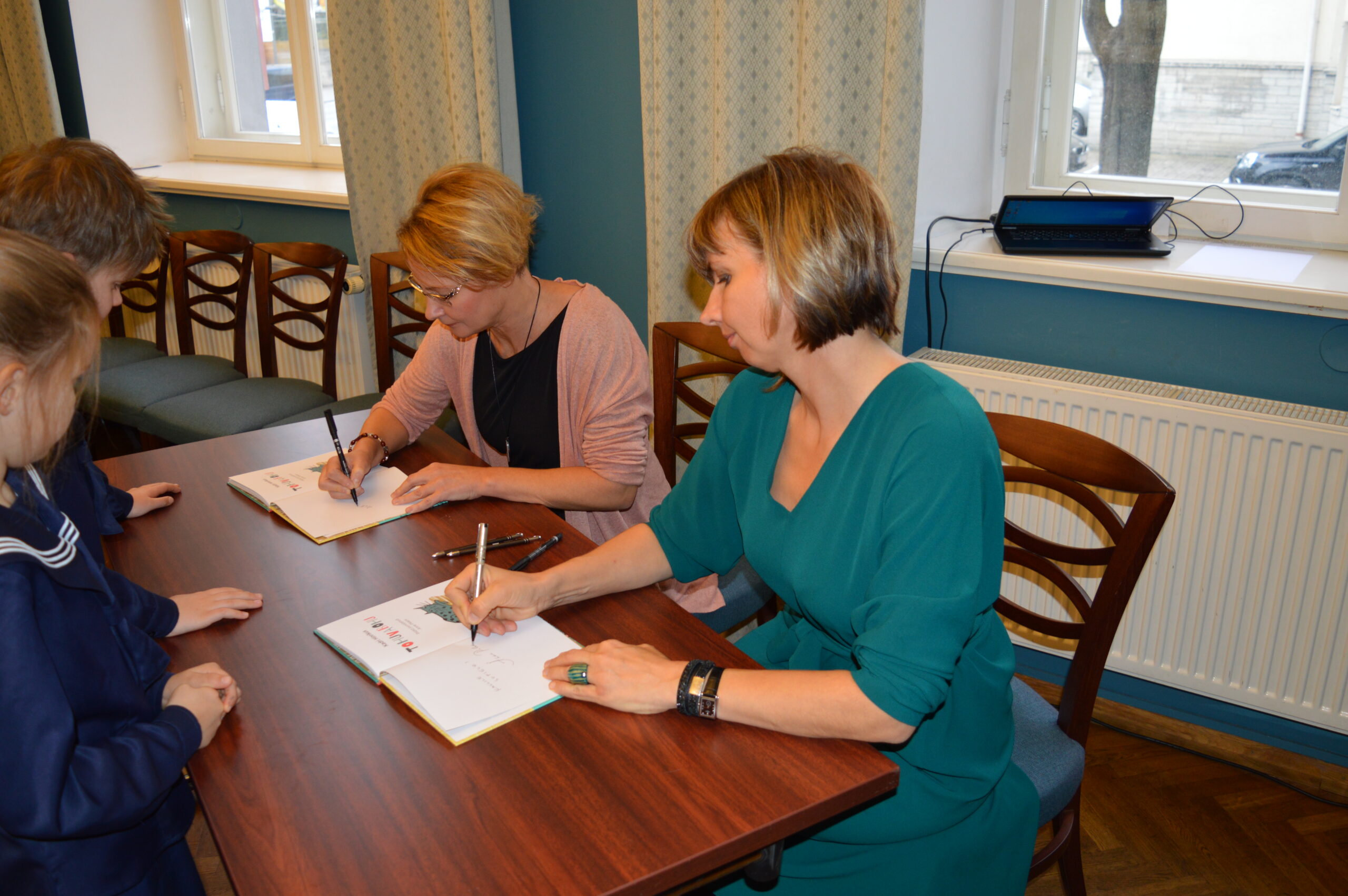 Raamatu „Tohuvabohu“ autor Kadri Hinrikus ja illustreerija Anne Pikkov (esiplaanil) jagasid väikestele lugejatele pühendusi. Eks pühendusega raamat ole ikka hinnalisem.