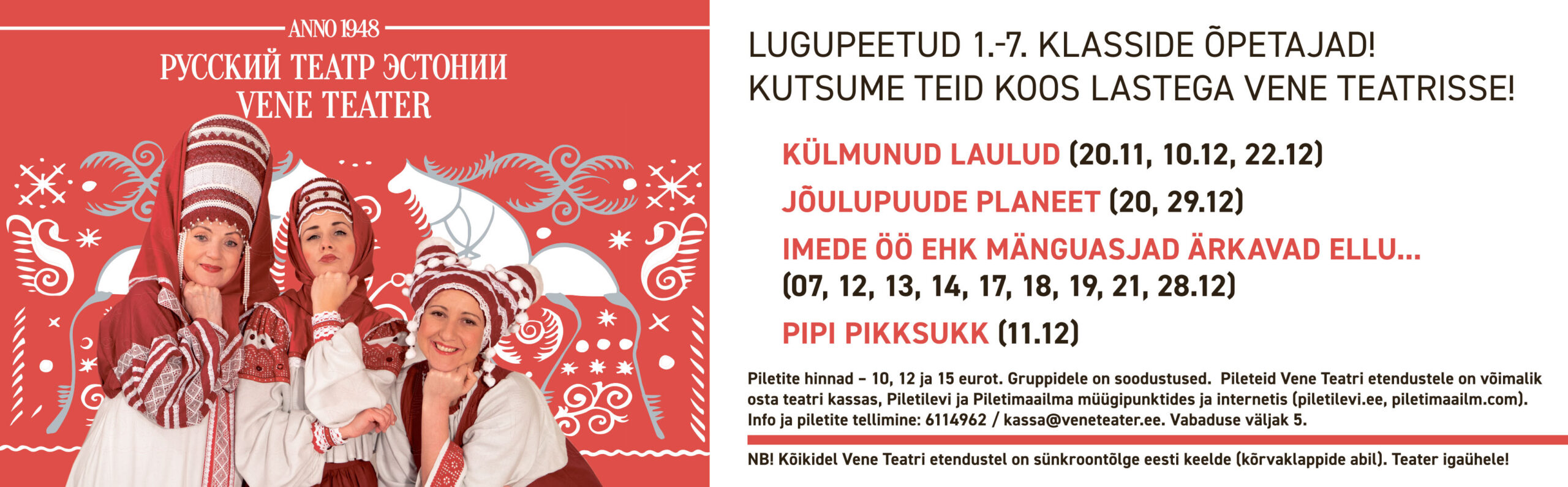 Pileteid Vene Teatri etendustele on võimalik osta teatri kassas, Piletilevi ja Piletimaailma müügipunktides ning internetis (piletilevi.ee, piletimaailm.com). Info ja piletite tellimine 611 4962 / kassa@veneteater.ee, Vabaduse väljak 5.