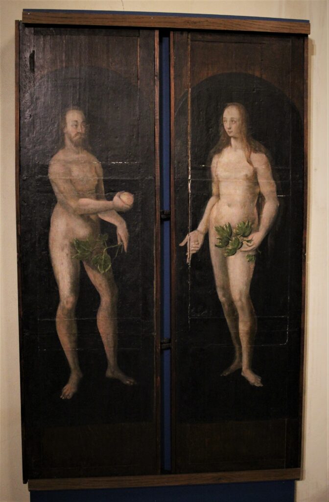 Aadam ja Eeva. Umbes 1600. Saaremaa muuseum. Keskajal nimetati Maarjat teiseks Eevaks ja Jeesust teiseks Aadamaks. Palvesõnades „Ave Maria“ on „Ave“ anagramm sõnast „Eva“.