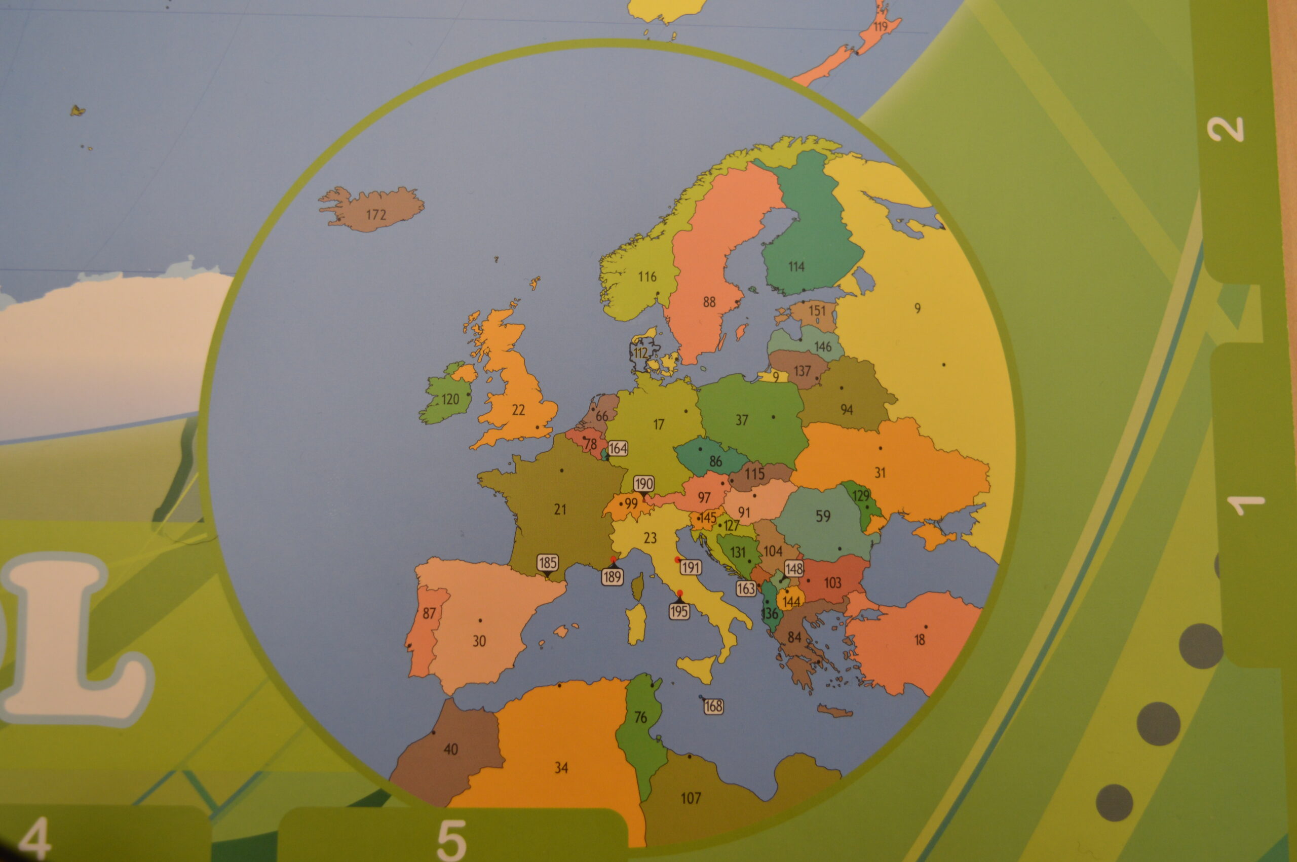 Maailmajagude jaotuse aluseks on võetud ÜRO regioonide loend. Välja on toodud ÜRO tunnustatud riigid. Riike tähistavad numbrid mängulaual tulenevad riigi kohast pingereas nende rahvaarvu järgi. Riikide nimekujud vastavad emakeele seltsi keeletoimkonna soovitustele (seisuga 7. aprill 2019)