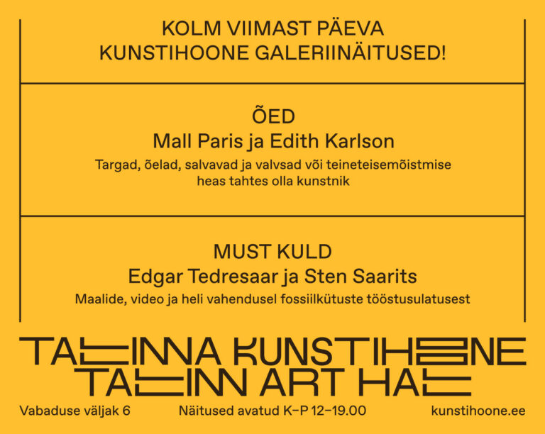 Kui mõelda probleemidele, mida meil on keeruline kriitilise pilguga vaadata, sest oleme neist pidevalt ümbritsetud, on hea näide 14. veebruaril Linnagaleriis avanev näitus „Ede Raadik. Parim, kes sa kunagi oled“ ning 20. veebruaril Kunstihoone galeriis avanev „Laura Kuusk. Armas algoritm“. Esimene tegeleb meid ümbritseva patriarhaalse süsteemiga, andes edasi ametialaselt ekspluateeritud naise kogemuslugu, ning toob meie ette ka viisi, kuidas vaadata enesehoolduse kultuuri – nii produktide enda kui reklaamide näol. Teine vaatab laiemalt ühiskondlikke norme ning käitumismustreid, mille järgi inimesed eri institutsioonides käituvad, innustades vaatajaid nende mustrite aluste peale sügavamalt mõtlema ning teisiti proovima.