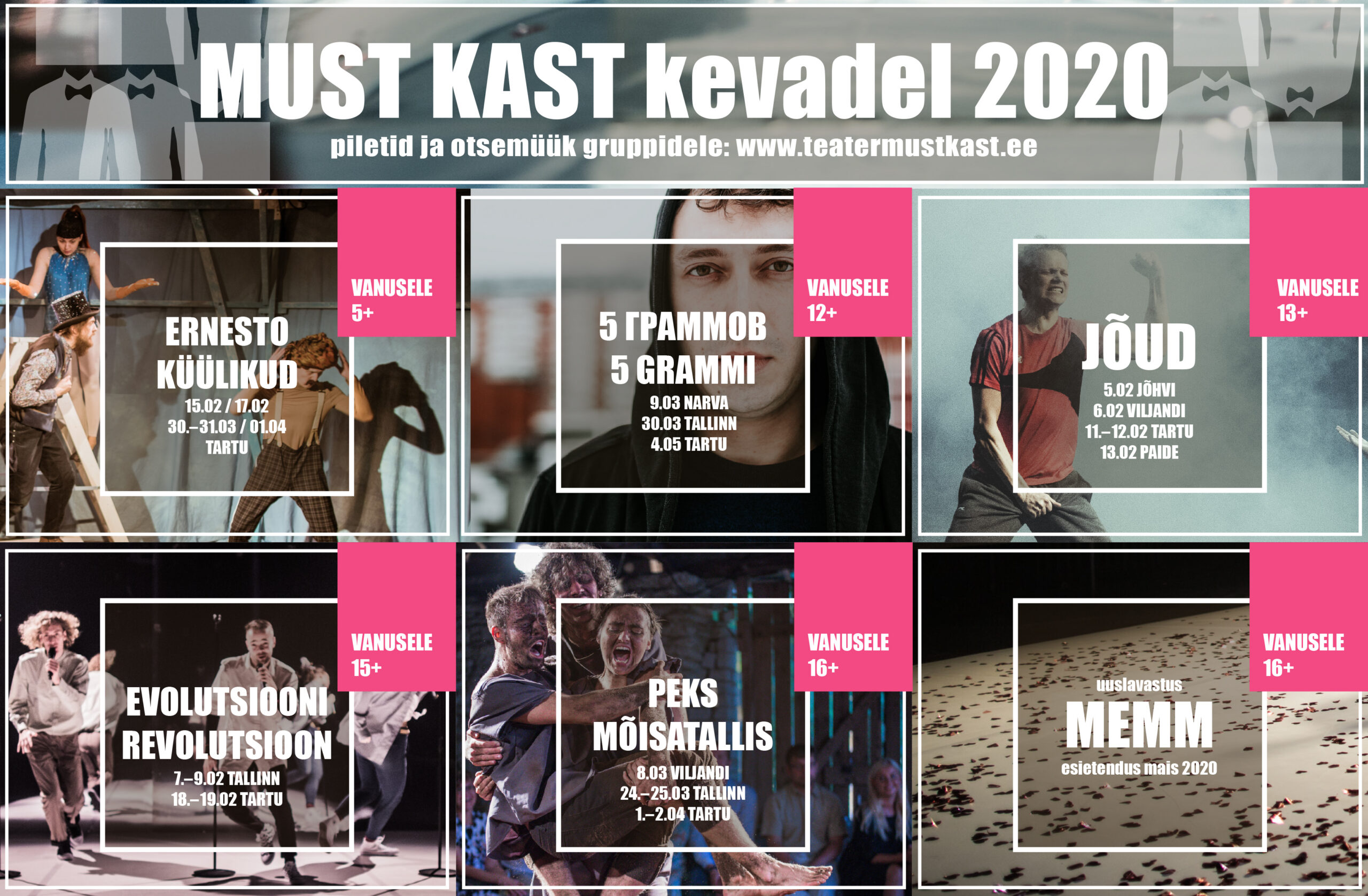 Must Kast pakub sel kevadel eriilmelisi teatrielamusi, mis ühendavad meelelahutuse mõtteainega. Sobilikku vaatamist jagub lasteaialastele, põhikooliõpilastele ja abiturientidelegi, õpetajatest-lastevanematest rääkimata.