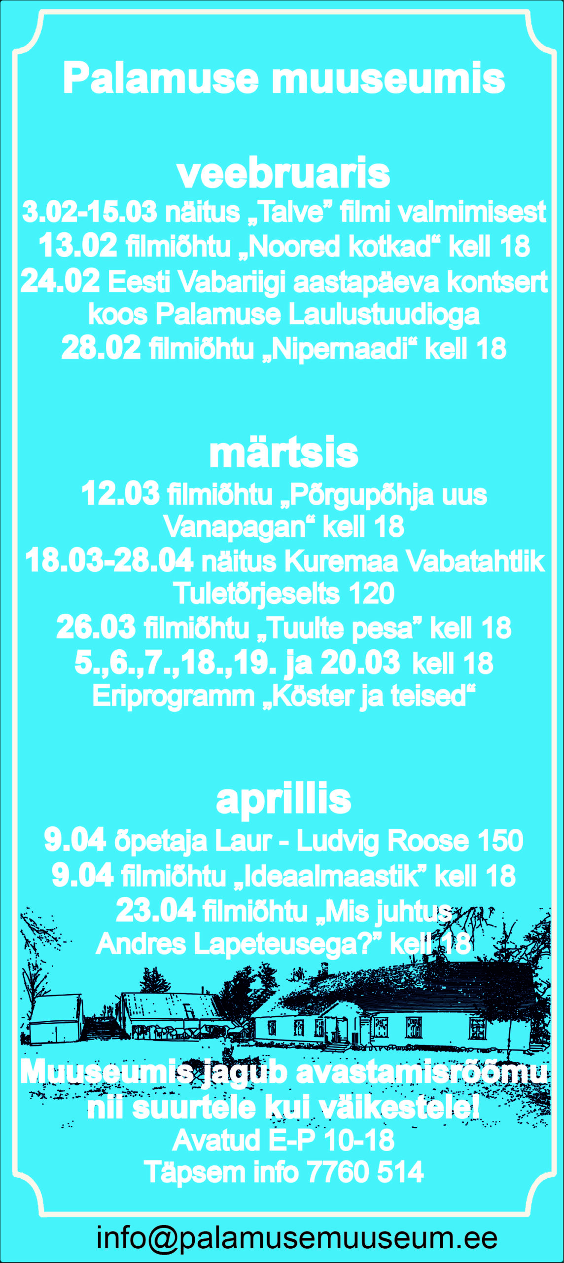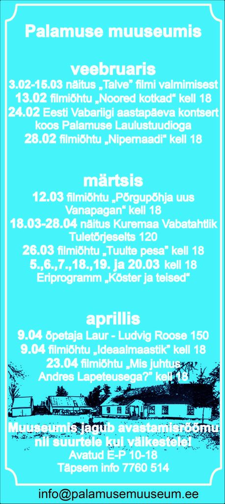 Palamuse muuseumis toimuvad 2020. aastal Eesti ajaloole pühendatud mängufilmiõhtud. Valikus on filme, mis ekraniseerivad Eesti kirjandusklassikat, aga näidatakse ka originaalstsenaariumidele tuginevaid linateoseid. Filmiõhtutel on külalistena filmide loojaid-tegijaid või ka filmides mänginud näitlejaid. Filmiesitused toimuvad kaks korda kuus neljapäeva õhtuti. Programmi on koostanud ning õhtuid juhib filmiajakirjanik ja -õppejõud Jaak Lõhmus.