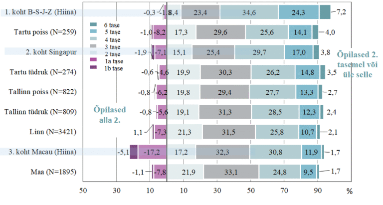 PISA 2018 uuringus osalenud linna- ja maapiirkondade õpilaste keskmiste tulemuste analüüs saavutustasemeti näitas, et tippsooritajate osakaal oli kõrgeim Tallinna (15,3%) ja Tartu (18,1%) koolides (joonis 1). Viimane näitaja on muljetavaldav ka rahvusvahelises võrdluses (joonis 1). Isegi meie maapiirkondade koolides jõuab 6. tasemele sama palju õpilasi kui kolmandale positsioonile jõudnud Macaus (Hiinas). Järelikult võiksime edendada haridusturismi nii Eesti-siseselt kui rahvusvaheliselt ja tutvustada parimaid kogemusi loodusainete õpetamisel. Samas kerkib üles küsimus, miks on meil nii vähe õpilasi huvitunud oma tulevase karjääri sidumisest loodusteadustega, kui teadmistes ja oskustes ollakse nii heal tasemel.