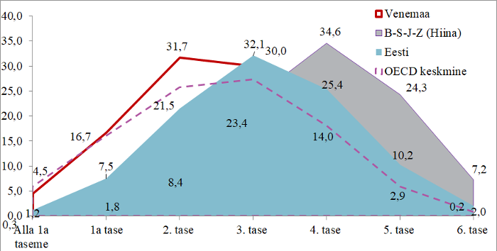 5. ja/või 6. taseme õpilasi võib nimetada tipptegijateks. Nemad suudavad demonstreerida kõrgel tasemel teadusliku analüüsi võimet, kriitilist ja loovat mõtlemist ning suurt iseseisvust uudsetes olukordades. Tippsooritajaid oli Eestis 12,2%, B-S-J-Z-s (Hiinas) 31,5%, Singapuris 20,7%, Macaus (Hiinas) 13,6%, Soomes 12,3% ja Venemaal 3,1%). Riikide järjestuses olime selle tulemusega kuuendal kohal. Võrreldes varasemate PISA uuringutega on aga tippsooritajate osakaal langenud.