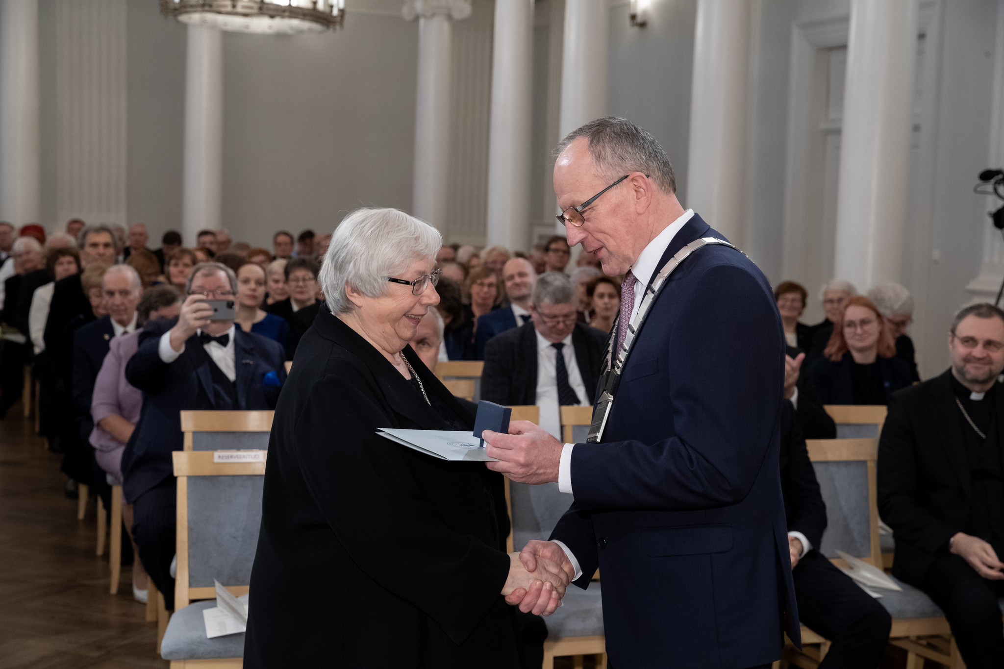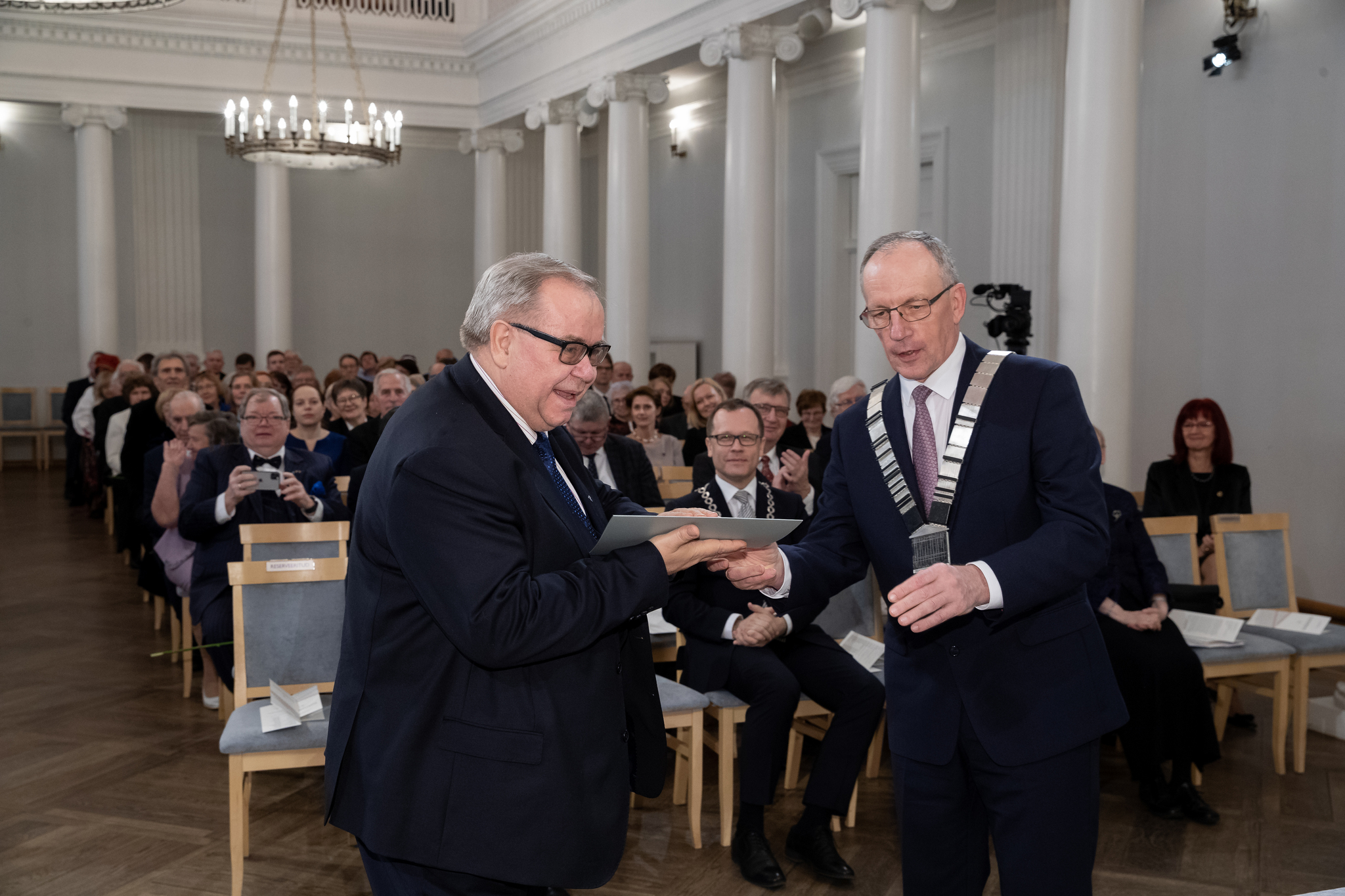 Teenetemärgi „100 semestrit Tartu Ülikoolis“ võtab rektor Toomas Asserilt vastu … Eesti geenivaramu eestvedaja, biotehnoloogia professor akadeemik Andres Metspalu.