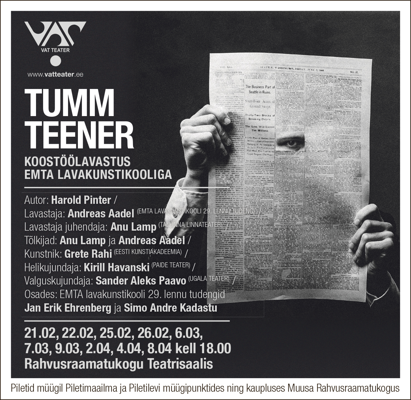 Uskumatu, aga VAT Teatris pole kõigi nende aastate jooksul veel ühtegi inglise legendaarse näitekirjaniku Harold Pinteri teksti lavastatud. Juba 21. veebruaril parandab selle vea EMTA lavakunstikooli lavastajatudeng Andreas Aadel, kes toob rahvusraamatukogu teatrisaalis lavale Pinteri näidendi „Tumm teener“. Lugu on pärit 1950-ndatest – suitsuste gangsterifilmide, sõjajärgse paranoia ja musta huumori ajastust.