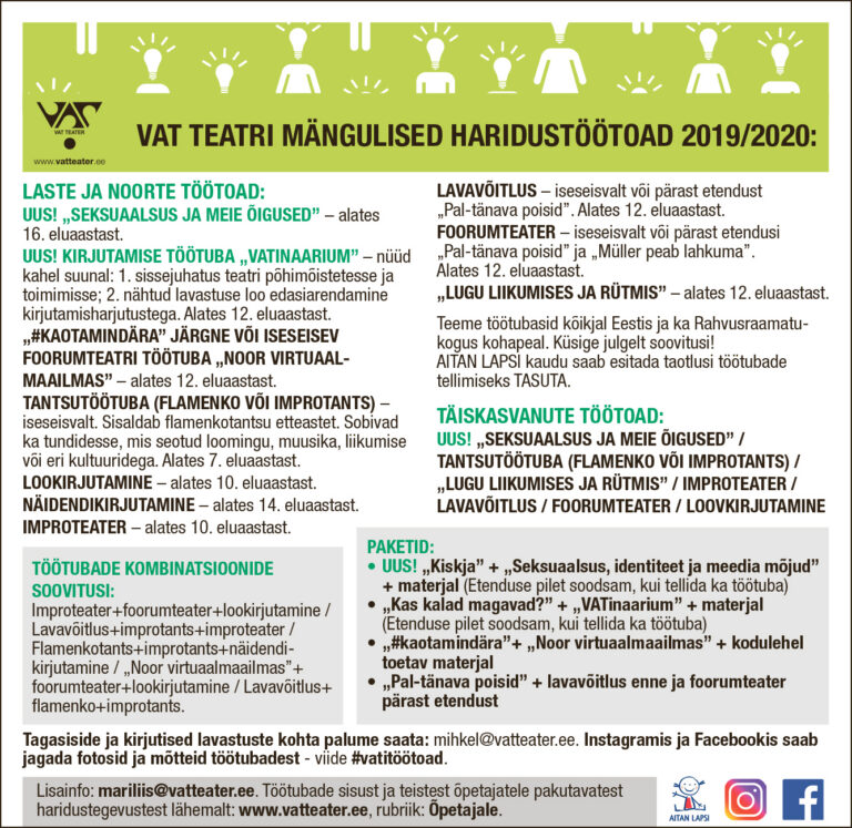 VAT Teatri haridustöötubasid iseloomustavad mitmeti rakendatavus ja paindlikkus. Leiutame aina juurde kasulikke võimalusi ja sooduspakette nii keerukaid teemasid (nt lein, seksuaalvägivald, koolikiusamine, internetiohud) sisaldavate lavastuste analüüsiks kui ka koolis mitmesuguste sündmuste ja projektide toetuseks – sotsiaalsete oskuste arendamisest tähtpäevade rikastamiseni. Kodulehel on mitmed uued koolivägivalla ennetustöö materjalid, millega kutsume kõiki huvilisi tutvuma.