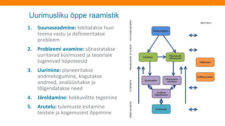 „Leidsime õpetajatega Ülenurmest ja Väike-Maarjast sellise lähenemise, et paneme tahvli servale kirja uurimusliku õppe mudeli etapid,“ lisab Margus Pedaste. „Kui need on kogu aeg silme ees, siis hakkame neid kasutama ükskõik millise probleemi lahendamisel ja teame, et saame seda paremini teha, kui oleme viis etappi läbinud.“