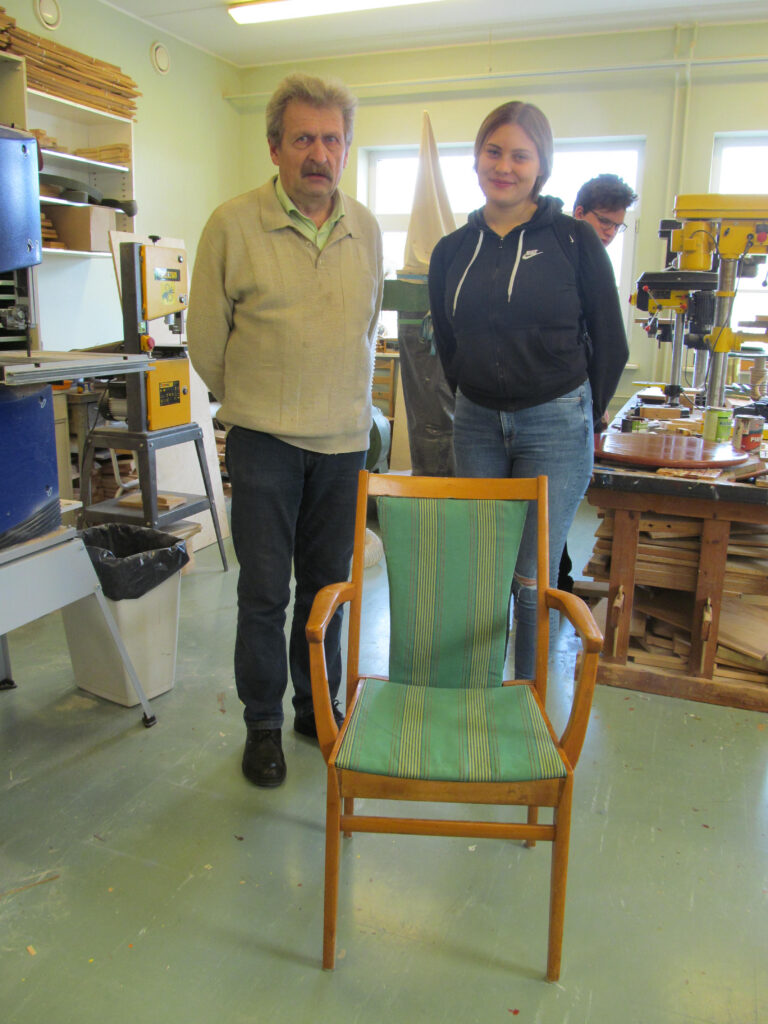 9. klassis õppiv Meeri, kes käib pärast käsitöötundi töökojas meisterdamas, enda restaureeritud tooli juures koos õpetaja Tõnis Türgiga.