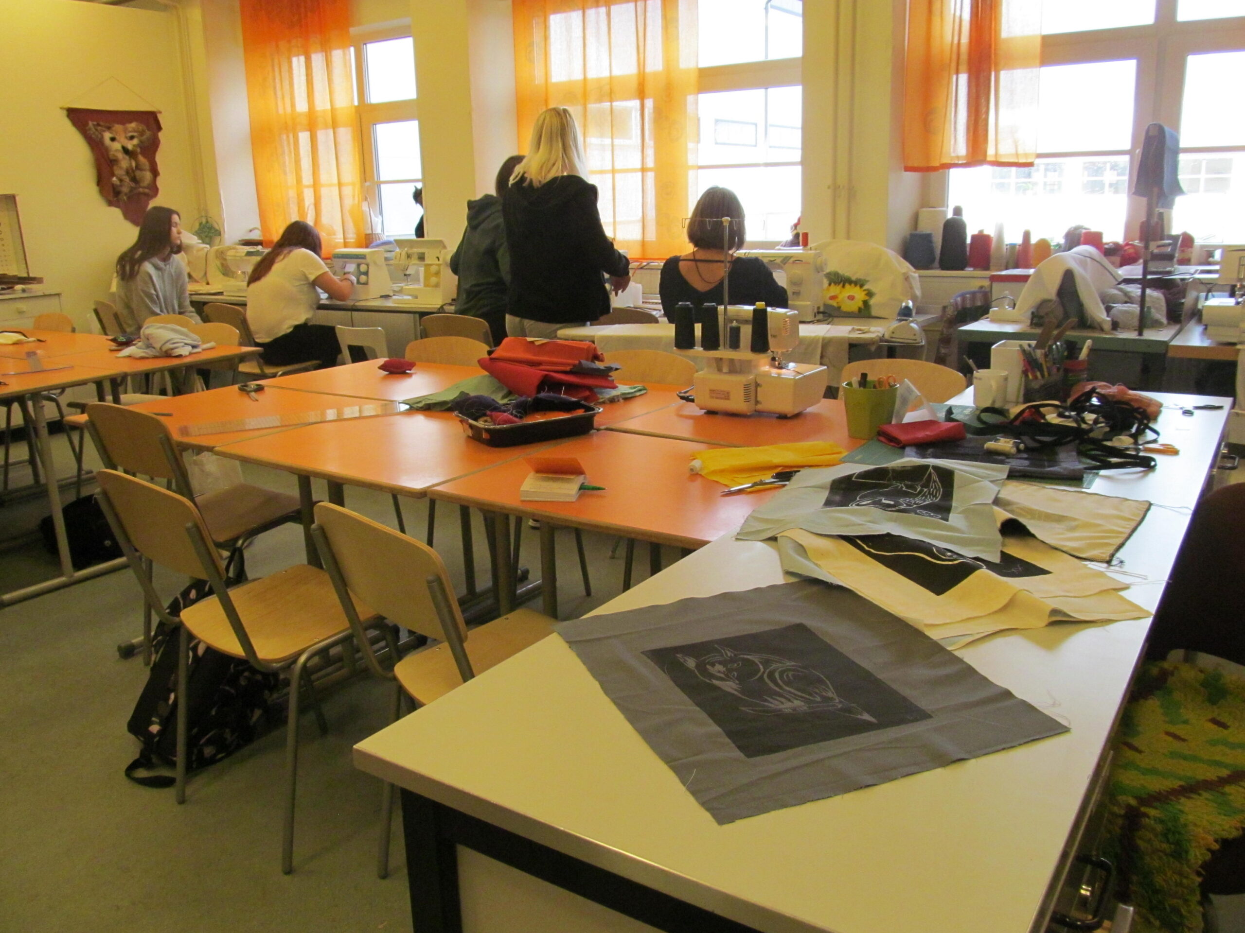 Kunstiõpetuses oli 9. klassil teemaks linoollõige, kus üks töö tuli teha kangale. Käsitöötunnis õmmeldakse kangale trükitud pildiga riidetükkidest kotid endale ja kinkimiseks kooli külalistele. „Lihtsa lõikega kott on ühe tunni töö, mis saab täna valmis,“ ütleb käsitööõpetaja.
