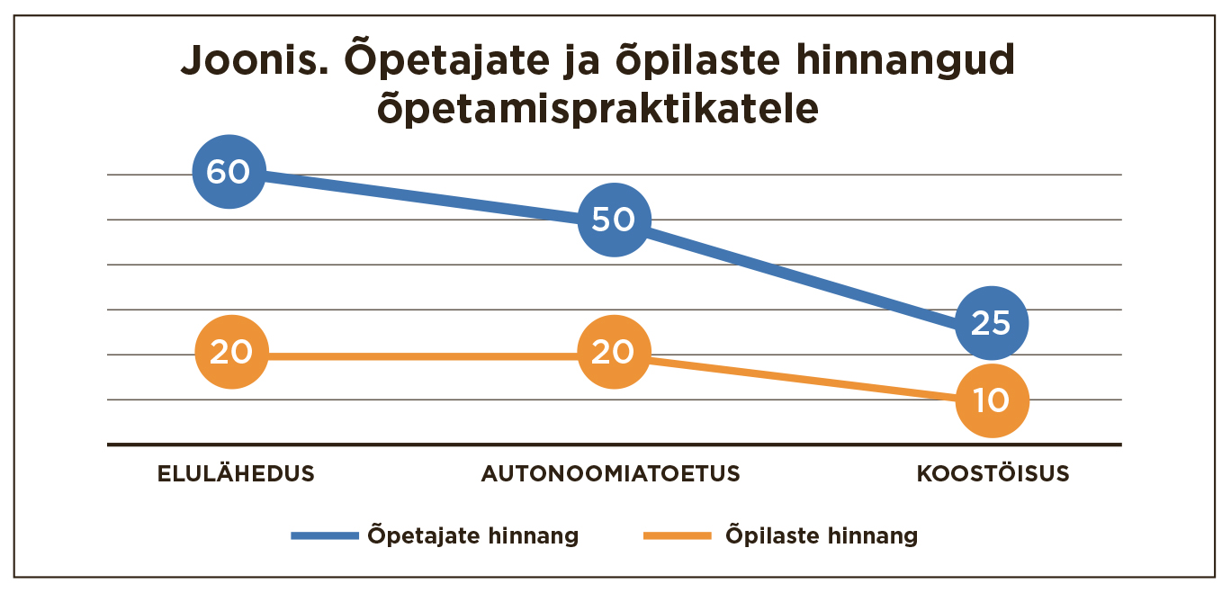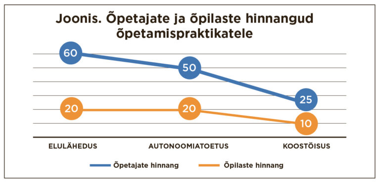 Teiseks – kõigi kolme õpetamispraktika osas on õpetajate (enese)hinnangu ja õpilaste tajutu vahel suured käärid. Õpetajad hindavad oma õpetamisviisi oluliselt elulähedasemaks, õpilaskesksemaks ja koostöisemaks, kui see õpilastele välja paistab. Seletuseks võiks ehk olla õpilaste suuremad (mõnikord isegi ebareaalsed) ootused kogu kolmiku suhtes – õpilased „tahavad rohkem“, õpetaja arvab, et „piisab küll“.