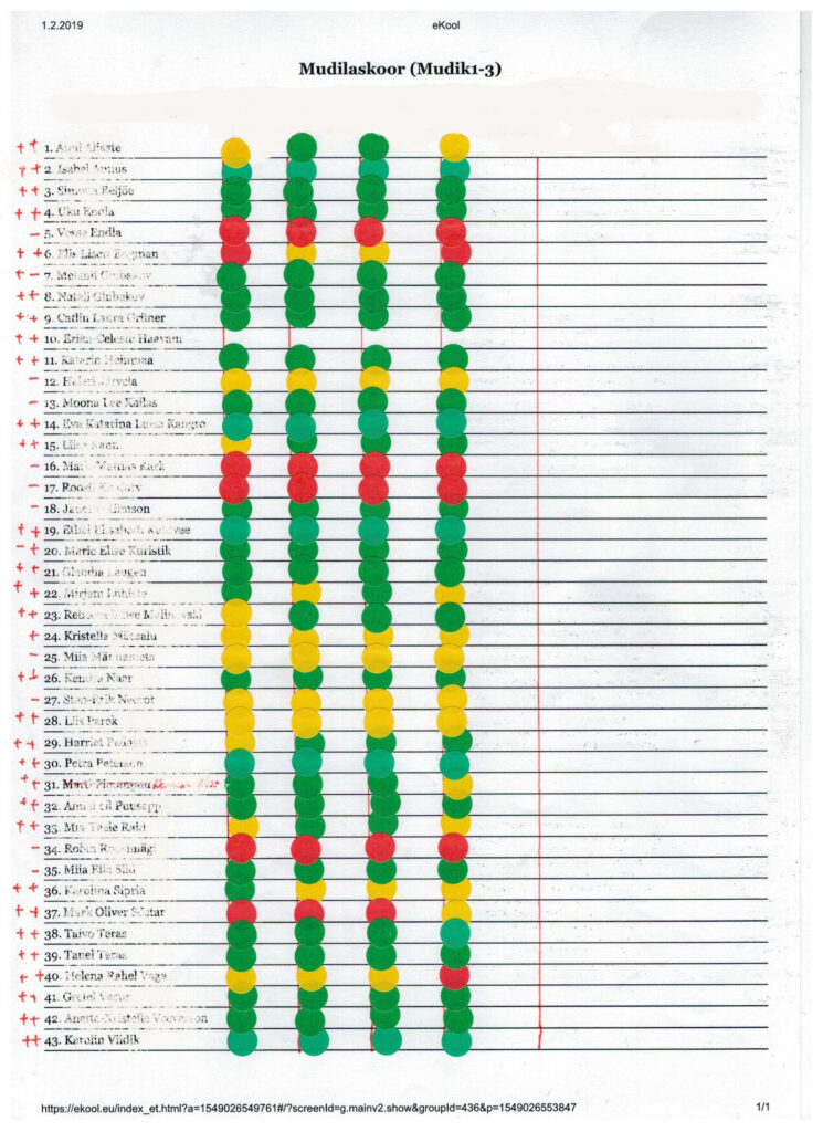 Endale tegin suure tabeli, kuhu märkisin iga laulja esitatud laulu juurde eri värvi kleepsu – nii tekkis hea ja kompaktne ülevaade sellest, kes on mõne laulu kehvemini omandanud. Selle info põhjal oli hea koridori peal vahetundide ajal mõni laps klassi kutsuda, et temaga laulu keerulisemaid kohti eraldi harjutada. Ideaalsel juhul võiks nõrgemate õpilastega arvestada juba muusikatundides ja harjutada seal lihtsamaid viisikäike, et nende juurest siis laulupeolaulu keerukamate viiside juurde edasi minna.
