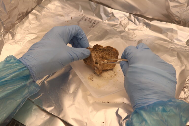 Luuproovi võtmine Tartu ülikooli genoomika instituudi vana DNA laboris. Foto: Samuel Griffith.