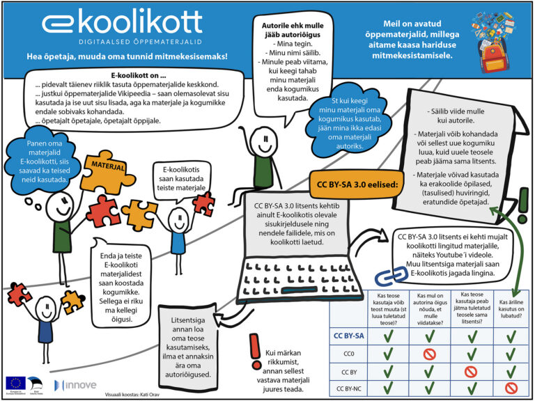 Alates veebruarist on riiklikus digiõppematerjalide portaalis E-koolikott kasutusel litsents CC BY-SA 3.0. Muudatus on tekitanud õpetajates segadust – miks ei saa materjali autor enam ise valida, millised õigused ta oma loomingule annab? E-koolikoti portaali eesmärki ning tehtud muudatuse ja valitud litsentsi tagamaid selgitab SA Innove.