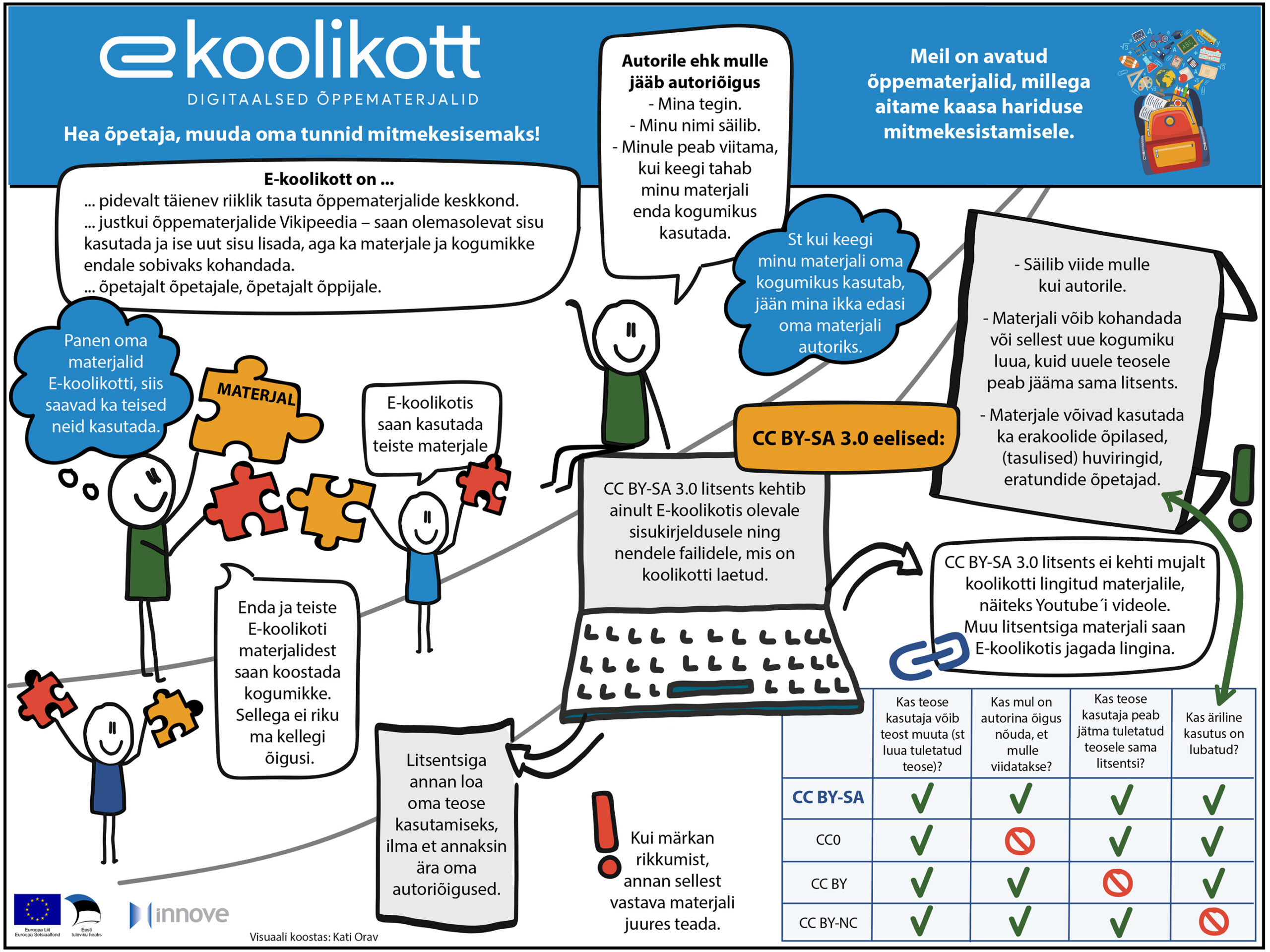CC BY-SA 3.0 tähendab, et igaüks võib teost kasutada, jagada ja muuta, kuid jagamise ja muutmise korral tuleb viidata autorile ja peab kohaldama sama litsentsi. Siin tuleb rõhutada, et litsentsiga annab autor loa oma teost kasutada, aga ei anna ära oma autoriõigusi. Oma õigusi autorina peab teadma; kui tunnete, et teie õigusi on rikutud, siis sellest tuleb teavitada, esmajärjekorras kontakteeruda rikkujaga. E-koolikotis saab vastava teate saata konkreetse materjali juures.