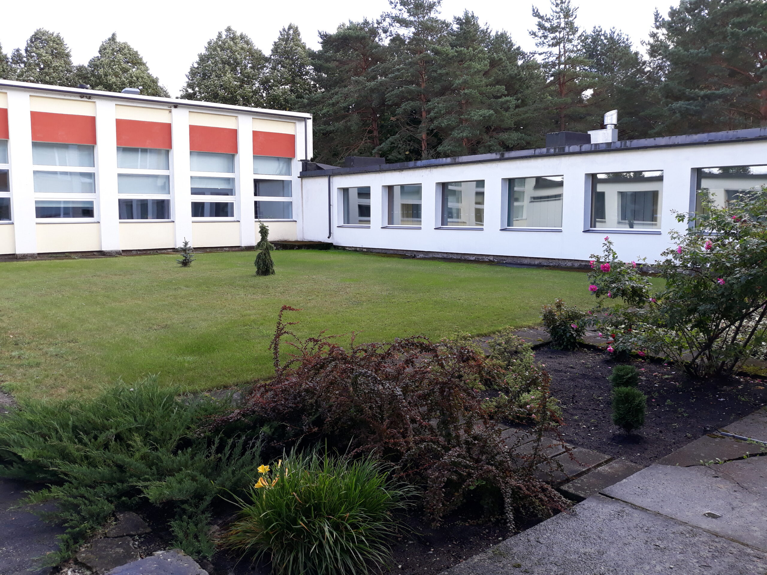 „Tolle ajastu kohta oli hoone väga edev,“ sõnas direktor majas ringkäigul. Palju on klaasseinu, söögisaali juurest on avanenud uks muruga kaetud sisehoovi, mis mõeldud ilusate ilmadega õues söömiseks. Seal küll ei sööda, kuid kevaditi peetakse aktusi.