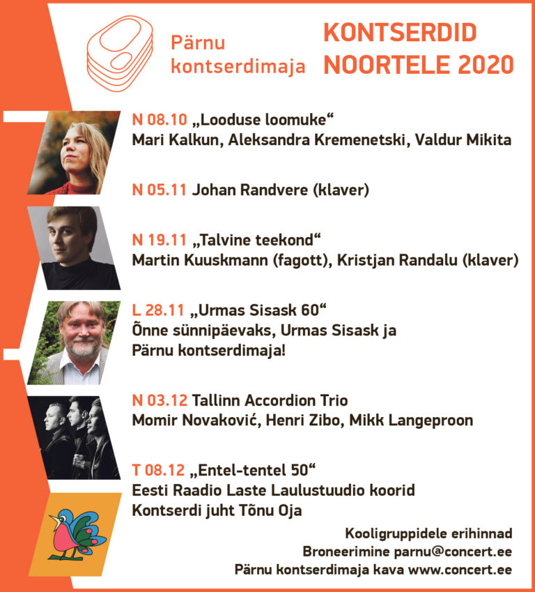 Selle aasta märksõnaks on saanud „Eelista eestimaist“, mis on üle kandunud ka meie kontserdisaalidesse. Tänavust hooaega Pärnu kontserdimajas rikastavad Eesti heliloojad ja tippmuusikud, kellest nii mitmedki on olnud hinnatud ning hõivatud välislavadel. Sügishooajal on sobilikke kontserte Eesti ühe parima akustikaga saalis muusikat armastavatele noortele ja täiskasvanutele. Lastekontsertidega alustame taas 2021. aasta alguses ja kevadel.