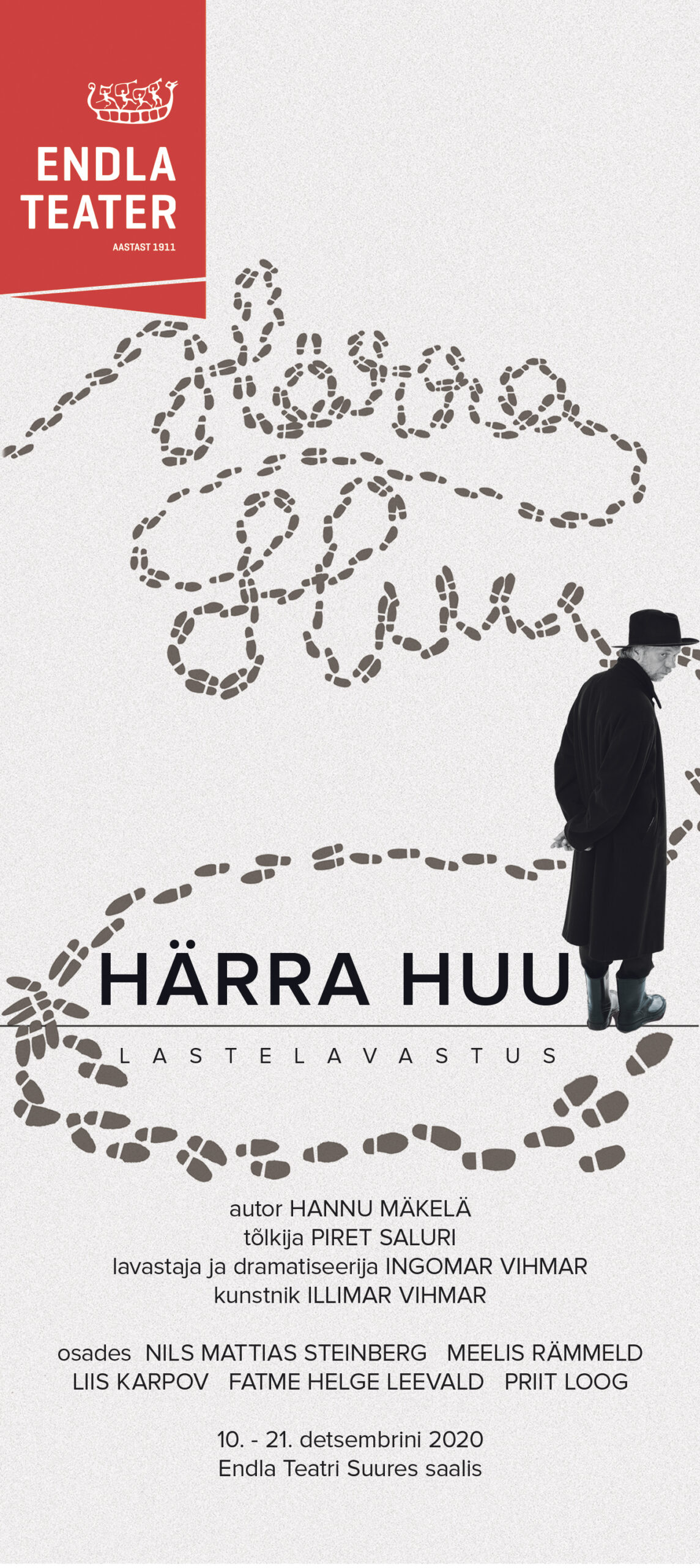 Hannu Mäkelä „Härra Huu“ etendub 10., 11., 12., 14., 15., 16., 17., 18., 19. ja 21. detsembril Endla teatri Suures saalis. Lavastuses mängivad Meelis Rämmeld, Nils Mattias Steinberg, Liis Karpov, Fatme Helge Leevald, Priit Loog.