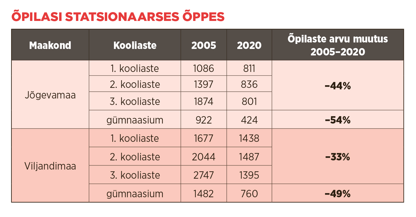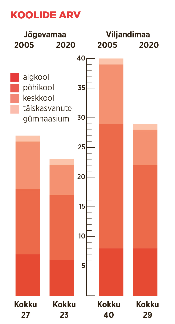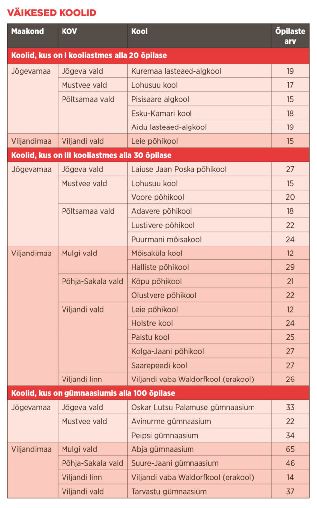 Paljud valla- ja väikelinnade koolid seisavad praegu silmitsi ühesuguste muredega: õpilaste arvu vähenemine, aegunud õpikeskkond, raskused kvalifikatsiooninõuetele vastavate õpetajate leidmisega ja tugispetsialistide puudus. Koolivõrgu killustatus ja koolide eraldatus pärsib lahenduste leidmist. Siiski on koolivõrgu küsimused päevakorral rohkem kui varem, vähemasti Viljandi- ja Jõgevamaa omavalitsustes.