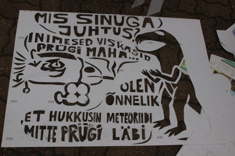 Kuna emotsioon oli laes, siis liikusime tegevustega koolimajast välja ka ise looma. Eesmärk oli edastada loodushoiu olulist sõnumit ka kunsti kaudu. Rahumäe kooli kaunite kunstide õppetooli õpilased disainisid #merialgabsiit stiilist lähtuvad kavandid, lõikasid välja trafaretid ja kandsid need, stencil-grafitist lähtuvalt kooli juures olevatele kanalisatsioonikaevude luukidele. Üks disaineritest, üheksanda klassi õpilane Kirke ütles, et kuigi kaevuluukide värvimine oli väsitav, tegi see ka palju rõõmu. Ta loodab, et pärast selle sõnumi nägemist ei viska inimesed enam konisid maha. Rahumäe põhikooli meediatiimi liige Mirta-Flo, kes toimuvaid tegevusi jäädvustas, sõnas, et kui ta pärast näitlemist koolist Valdeku bussipeatuseni kõndis, paistsid need sõnumid kanalisatsiooniluukidel talle väga lahedad. Samuti kiitis ta vahvat seltskonda.