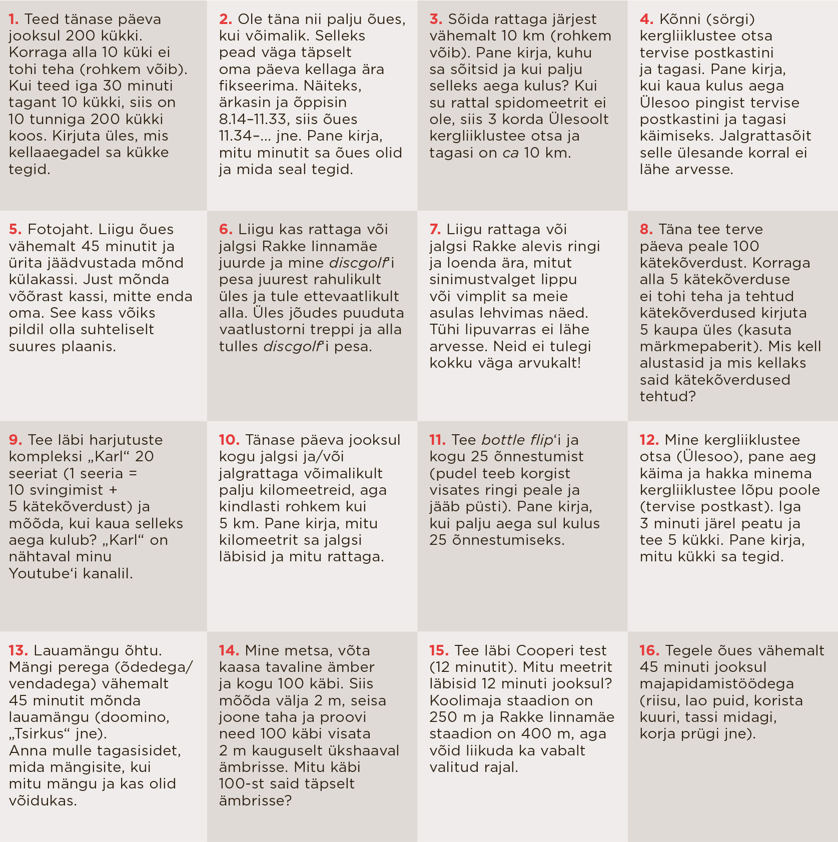 Reedel ootasin igalt õpilaselt lühikest kokkuvõtet andmetega, mida ja mis päeval tehti, kui palju kulus aega jne. Lisaks palusin igal õpilasel valida välja neli päeva, mida ta sooviks, et õpetaja teeks. Enim hääli saanud tegevused tegin ära. Õpilaste soovide kohaselt tuli mul endal läbi teha bottle flip 25 korda aja peale, seda sooviti kaheksal korral. Cooperi testi sooviti kuuel korral. „Kassijahti“ ja jalgrattaga sõitmist järjest vähemalt 10 km sooviti viis korda. Need neli tegevust tegingi selle bingomängu ajal läbi.
