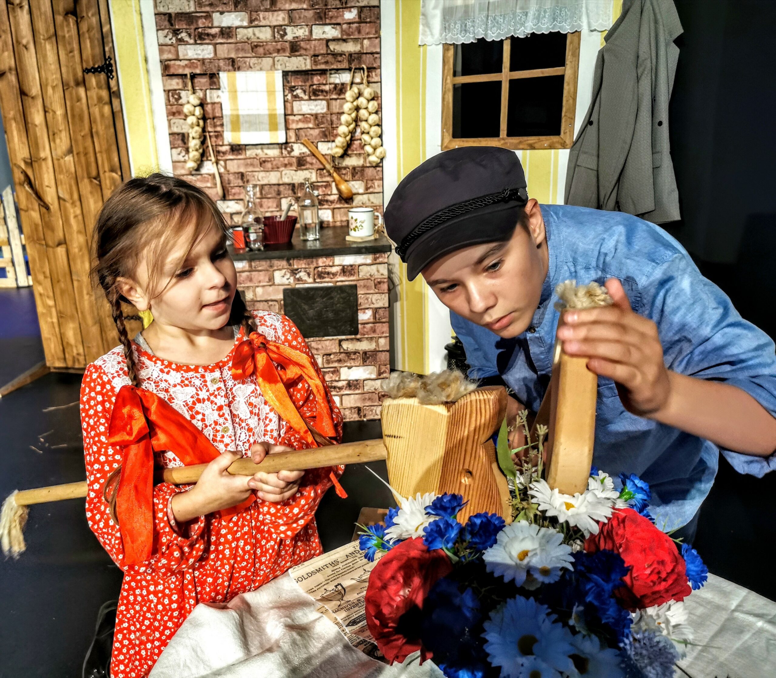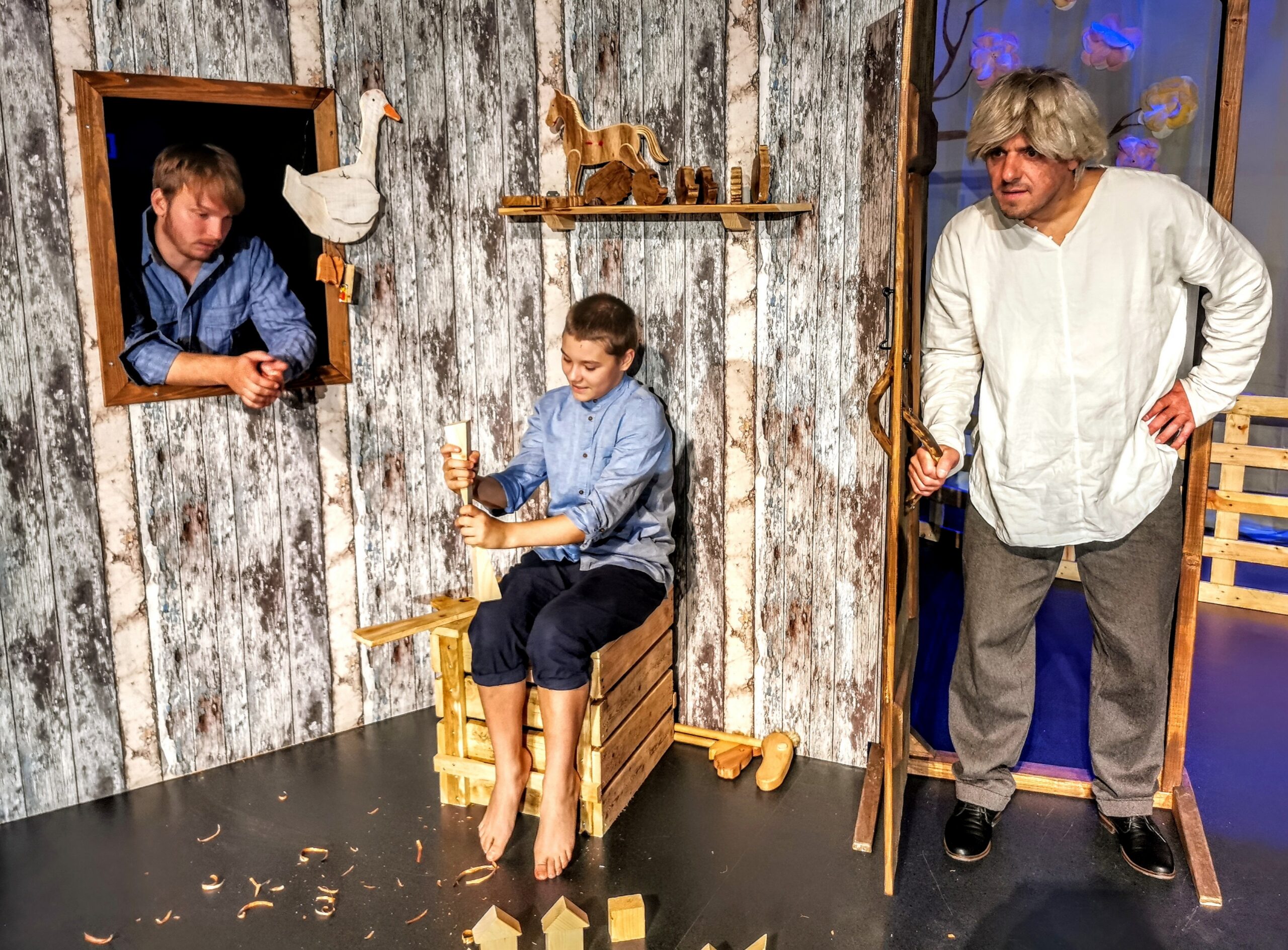 Vahel saadab isa Anton (Tauno Paulus) pahandust teinud poisi puutöökotta, kus ta kujukesi nikerdab. Aknast vaatab parajasti sisse sulane Albert (Margus Christopher Kalda). Fotod: Kadri Paldra