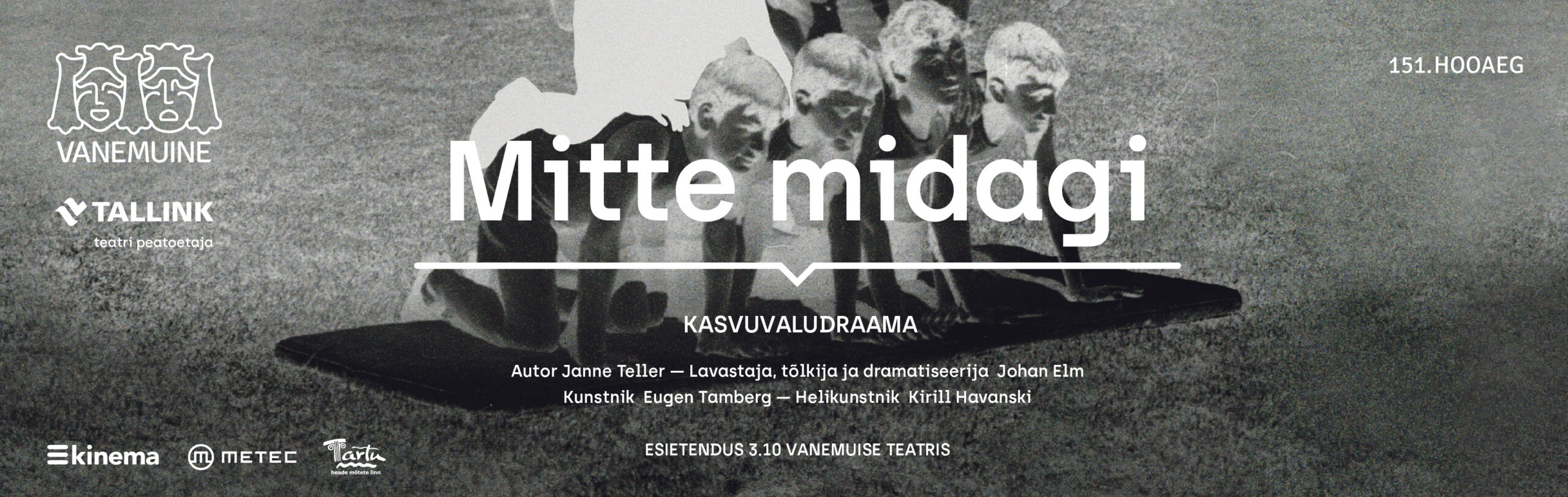 Vanemuise teatri draamatrupis alustasid sel sügisel tööd tervelt viis kevadel lavakunstikooli lõpetanud noort näitlejat: Lena Barbara Luhse, Maarja Johanna Mägi, Oskar Seeman, Ken Rüütel ja Kaarel Pogga. Esimese tööna toovad nad (lisaks neile veel Jaanus Tepomees) 3. oktoobril Sadamateatris välja oma nägemuse taani kirjaniku Janne Telleri noorteromaanist „Mitte midagi“. Lavastab kaks aastat tagasi lavakunstikooli lõpetanud noor lavastaja Johan Elm.