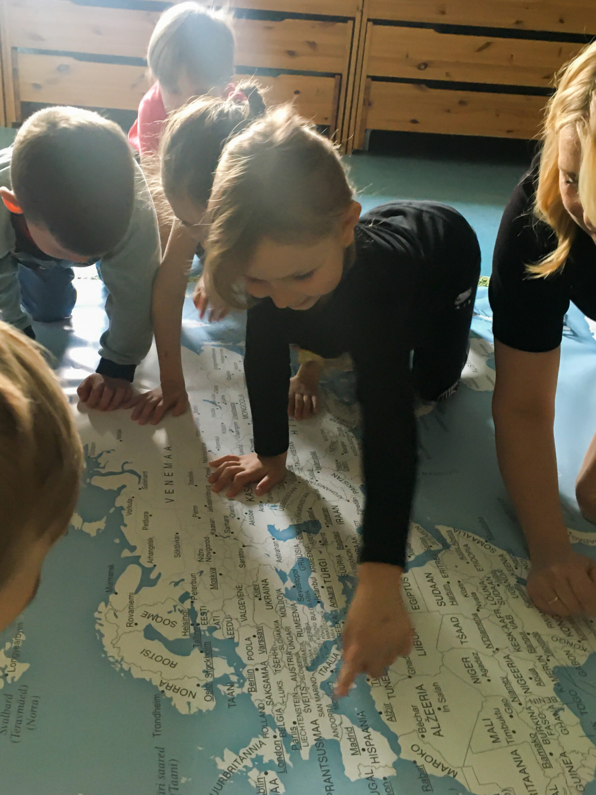 Maailmaharidust õpetatakse lasteaedades mängides ja avastades. Kes teab, kus asub kaardil Portugal? Foto: MTÜ Mondo