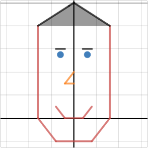 Näo joonistamine lineaarfunktsioonide valemeid muutes. Näo püstised põsejooned näevad võrranditena välja nii: x = -2 {0 < y < 4} (vasak) ja x = 2 {0 < y < 4} (parem). Põsejoonte asukoha muutmiseks peab õpilane muutma neid võrrandeid. https://teacher.desmos.com/activitybuilder/custom/57071a80e51ffd0909962916?lang=et