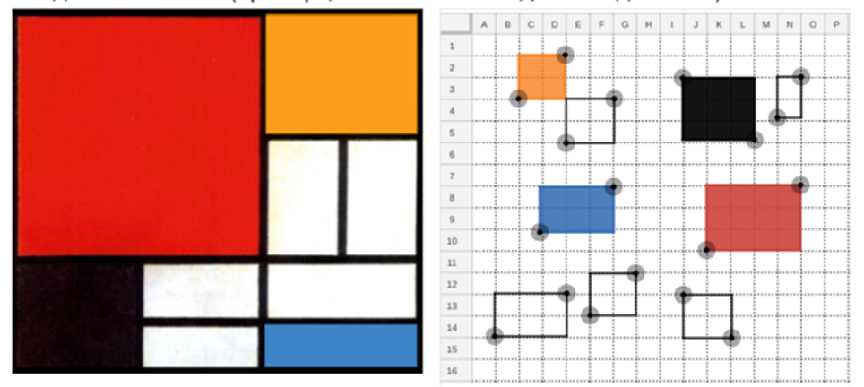 Õpilased saavad arvutiekraanil hiirega ristkülikuid lohistades kokku panna Mondriani teosega sarnase pildi. Õpilane peab katsetamise ja proovimise teel ise avastama, kuidas on võimalik ruudustikul asuvaid punkte liigutada ning seal asuvate objektide asukohta ja suurust muuta. Samal ajal on tal võimalus iseseisvalt kontrollida oma mudeli „õigsust“ ehk võrrelda seda visuaalselt valmis tööga (vasakul).