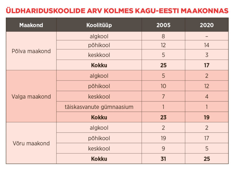PÕLVA-, VALGA- JA VÕRUMAA KOOLIVÕRK: KOOLIVÕRGU ÜMBERKORRALDAMINE ON KAGU-EESTI HARIDUSELU SUURIMAID KATSUMUSI.