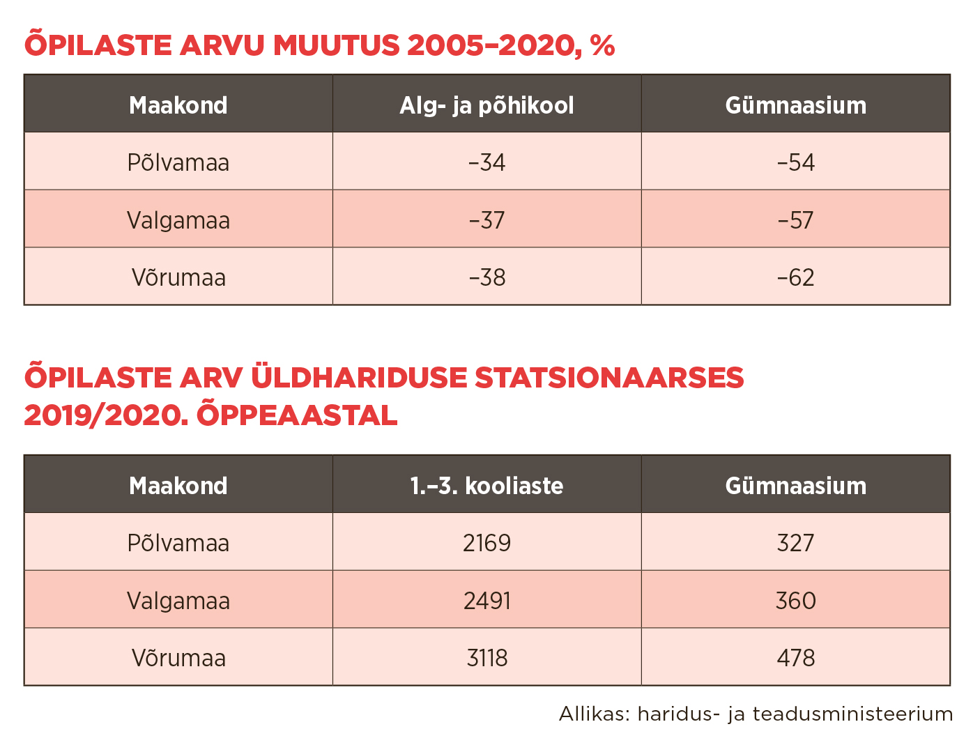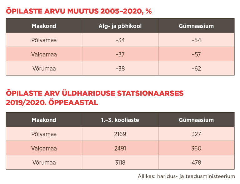 Kagu-Eestis on õpilaste arv langenud maakonniti mõneti erinevalt. Näiteks suurima õpilaste arvuga Võrumaal on toimunud viimase 15 aasta jooksul piirkonna suurim langus, kuid prognoosi järgi järgmise 15 aasta jooksul õpilaste arv nii suurel määral enam ei muutu. Kahanemine siiski jätkub ning koolivõrk tuleb kujundada laste arvu järgi.