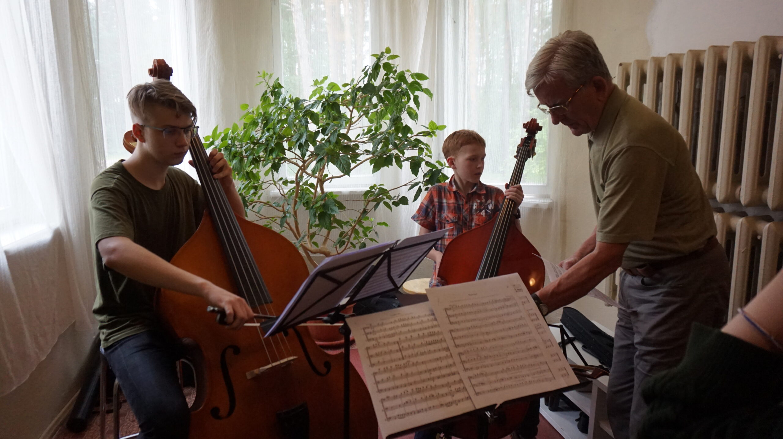Kaupo Olt ja noor kontrabassimängija Alfred Vürst 2019. aasta suvel Värska keelpillilaagris. Fotod: erakogu