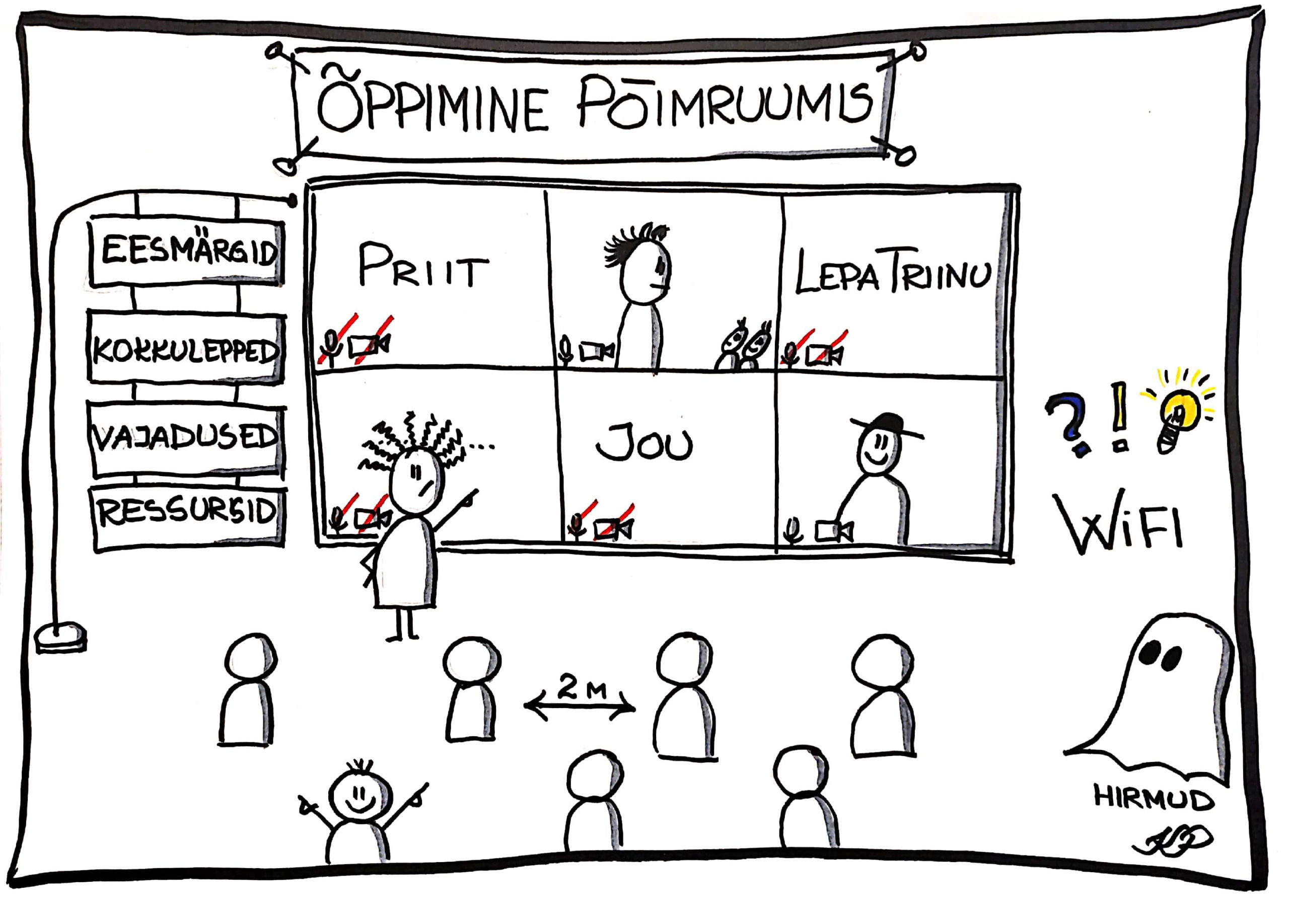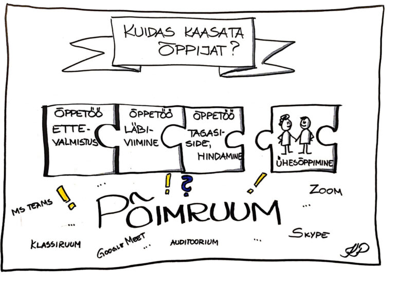 „Hei, Zoomi-inimesed, olete te veel seal?“ pöörab õppejõud keset loengut pilgu oma sülearvuti ekraanile. Järgnevad sekundid piinlikku vaikust. „Merili, Anne, Ermo, kas te kuulete meid?“ proovib õppejõud uuesti virtuaalses ruumis õppijate tähelepanu köita. „Oleme nendega vist kontakti kaotanud,“ annab õppejõud alla ning pöörab oma tähelepanu auditooriumis istuvate üliõpilaste poole, kes hoiavad üksteisega püüdlikult distantsi.