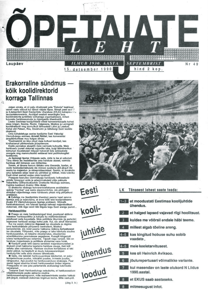 8. detsembril 1990 kogunes Estonia teatri saali 393 koolijuhti, et panna alus Eesti koolijuhtide ühendusele (EKJÜ). Kolme aastakümne eest valitsusele ja ülemnõukogule läkitatud nõudmised – tõsta haridustöötajate palgamäär 1,5-kordseks Eesti keskmisest töötasust ja lahendada vene rahvuskooli arenguprobleemid – on praegugi aktuaalsed.