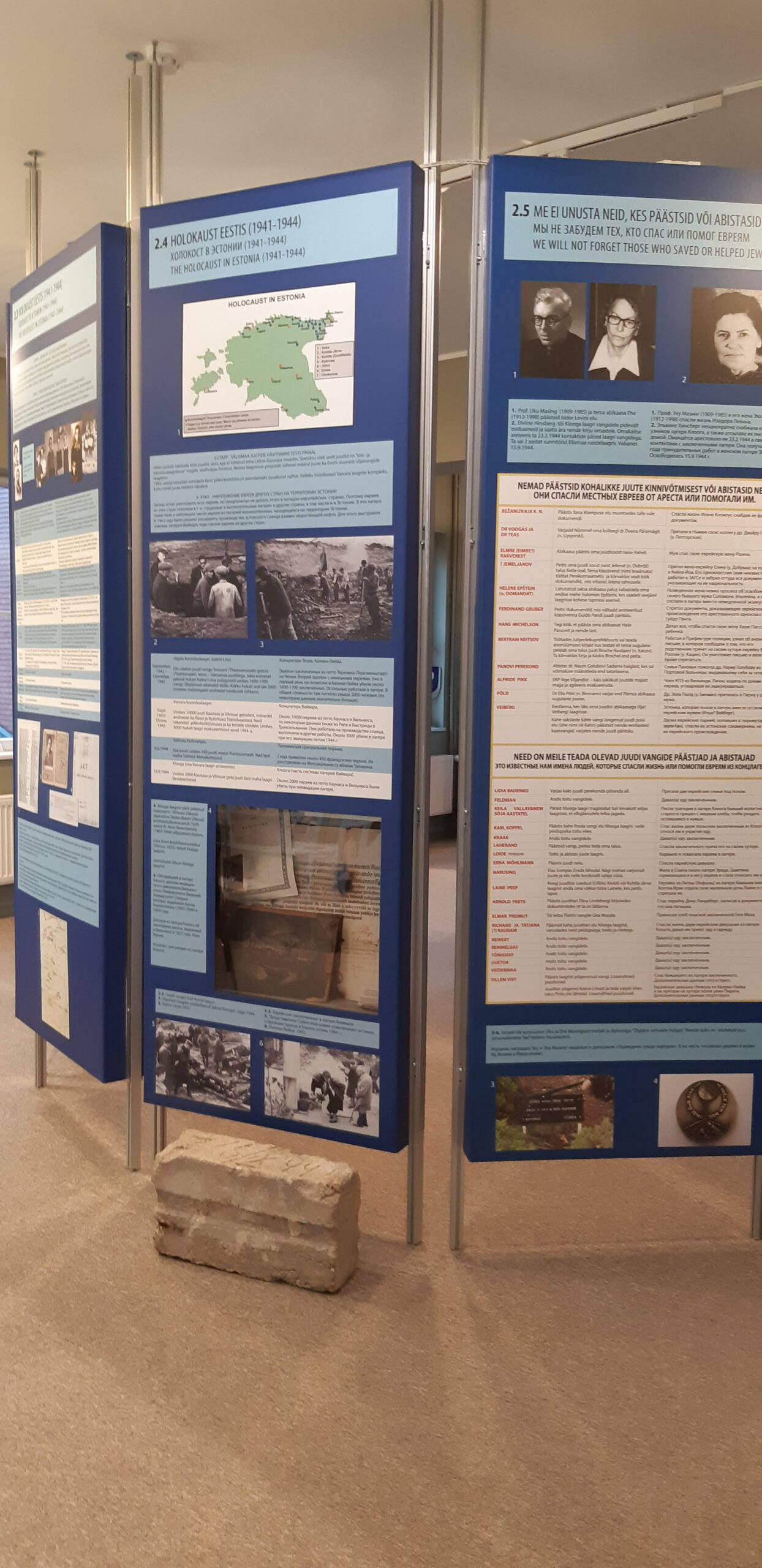 Holokausti teine etapp algas Eestis 1942. aasta septembris, kui siia hakati tooma juute teistest okupeeritud riikidest. Osa neist, peamiselt vanurid, naised ja lapsed, lasti maha kohe pärast saabumist. Töökõlbulikke mehi ja naisi pandi koonduslaagritesse. Eesti territooriumil loodi ligi 30 koonduslaagrit, peamiselt Kirde-Eestis. Juudi vangid töötasid põlevkivikaevandustes, õlivabrikus, metsatöödel. Ebainimlike tingimuste ja laagrivalvurite piinamiste tõttu oli suremus väga kõrge. Nõukogu armee tungides Eesti aladele viidi osa ellujäänud vange meritsi teise koonduslaagrisse (Stuthof), osa aga toodi Klooga koonduslaagrisse, kus vangid pidid valmistama telliskive kaitserajatiste ehitamiseks või tegema metsatööd. Muuseumi ekspositsioonis on 16.09.1944 valmistatud betoontelliskivi.