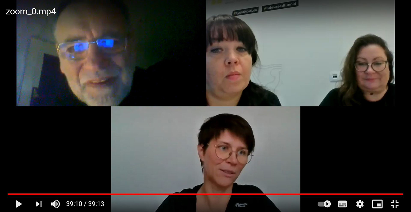 Hetk Zoomi vestlusest: Üleval õpetajad Kätlin Sass ja Katre Sosi ning all Signe Abel. Ülal vasakul osaleb vestluses artikli autor. Foto: kuvatõmmis