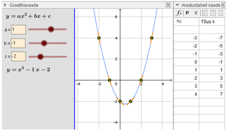 Joonis 1. Uut moodi matemaatika näide. Uuri, mis juhtub funktsiooni y = ax2 + bx + c graafiku puutuja tõusuga k kohal x0 = 0, kui muuta parameetrit a. Põhjenda oma uuringu tulemust.