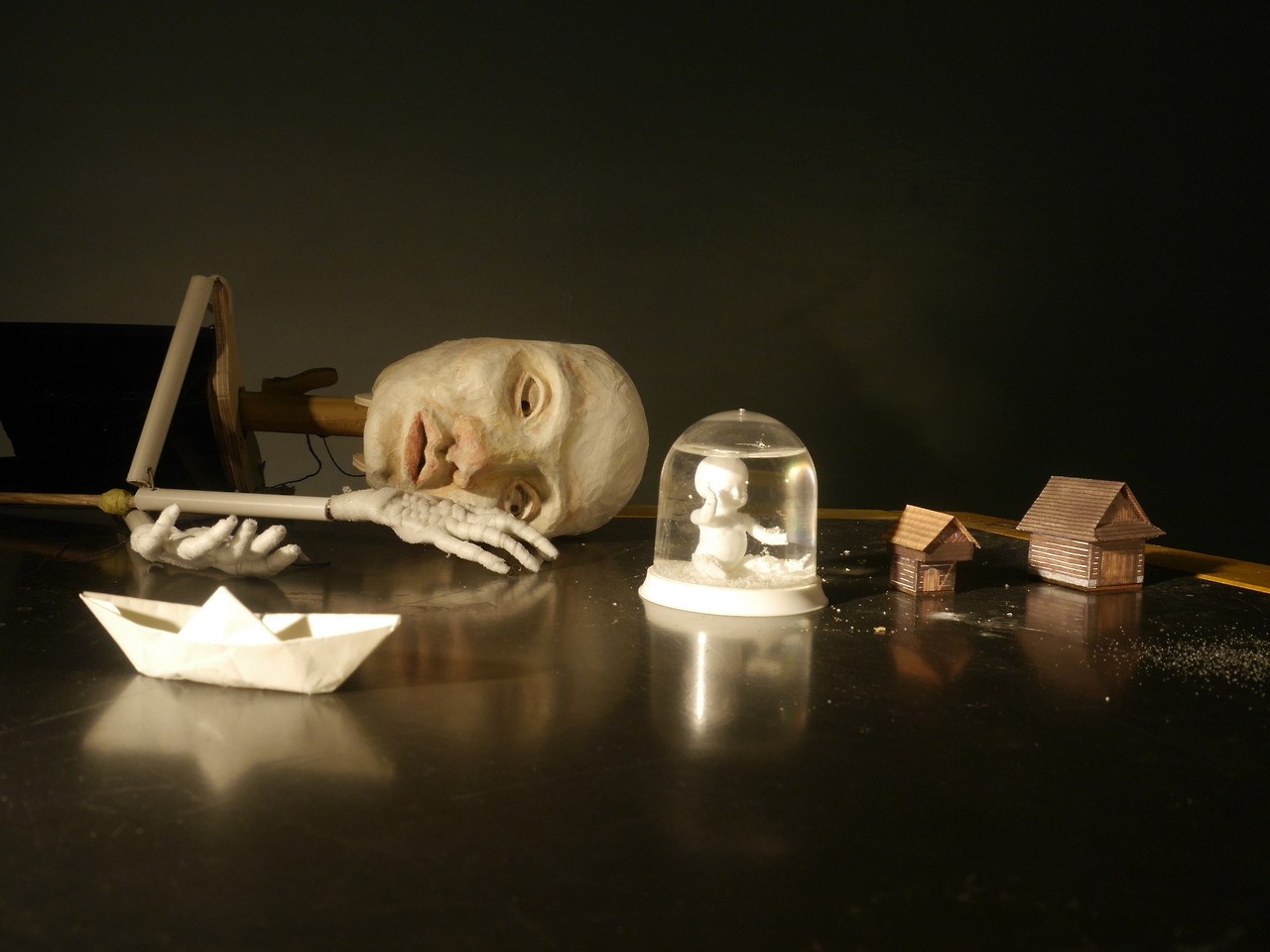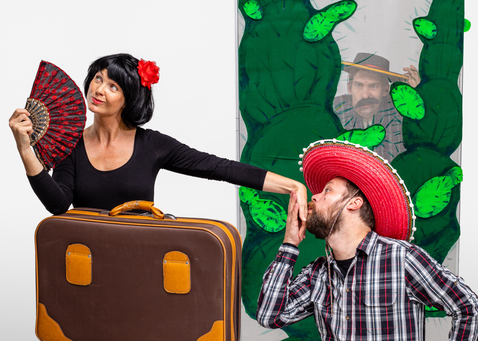Lasteteater Sõber „Maailm kohvris“. Kadri Bergmann, Priit Öövel ja Tanel Bergmann. Foto: Priit Grepp