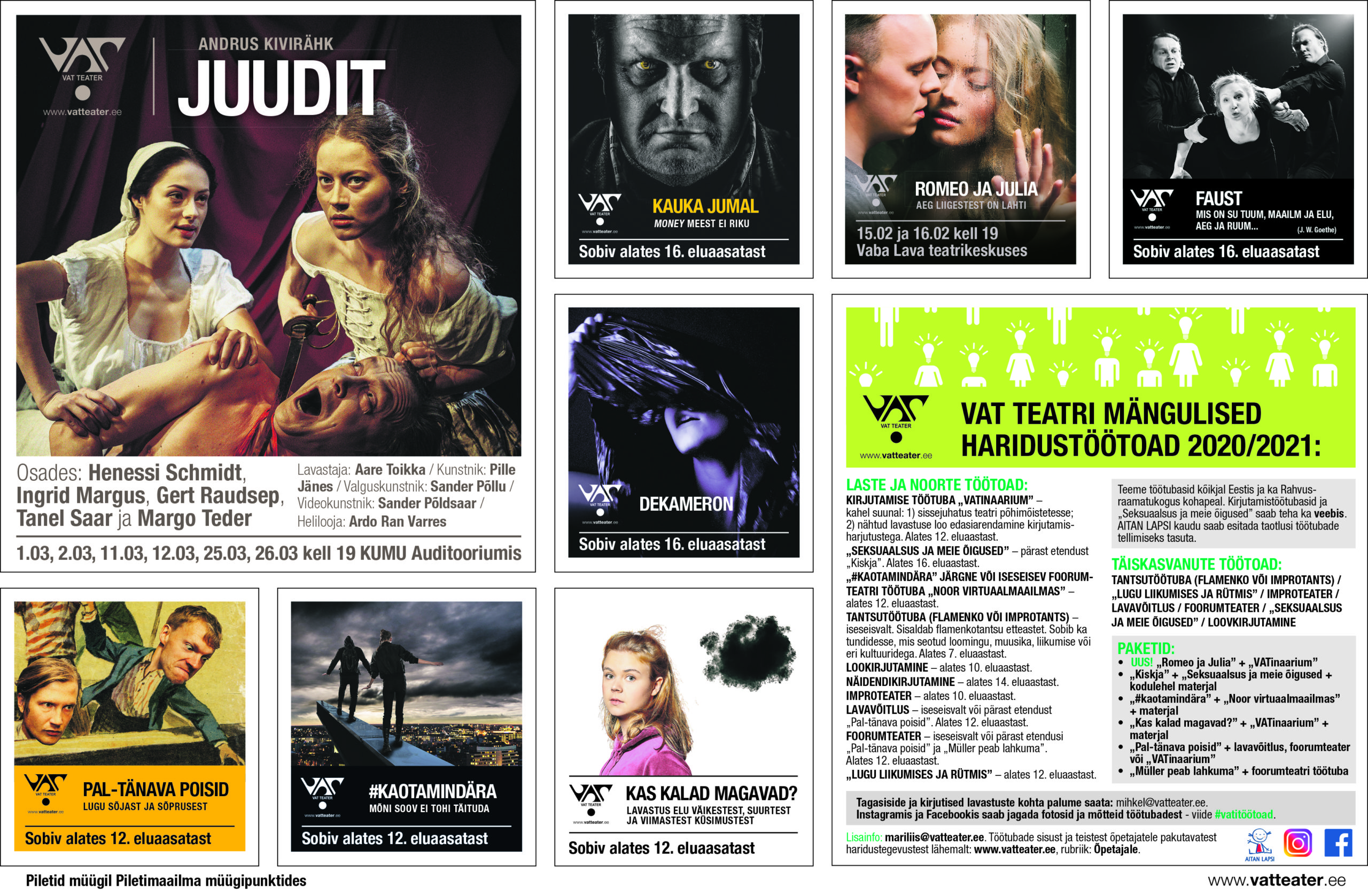 VAT Teater rõõmustab koos teiste Harju- ja Ida-Virumaa etendusasutustega võimaluse üle veebruari algusest taas etendusi anda. Et meie teatri mängusaalid on suhteliselt väikesed, saame koostöös koolidega pakkuda siin kõige turvalisemaid viise kooligruppide teatrikülastusteks.