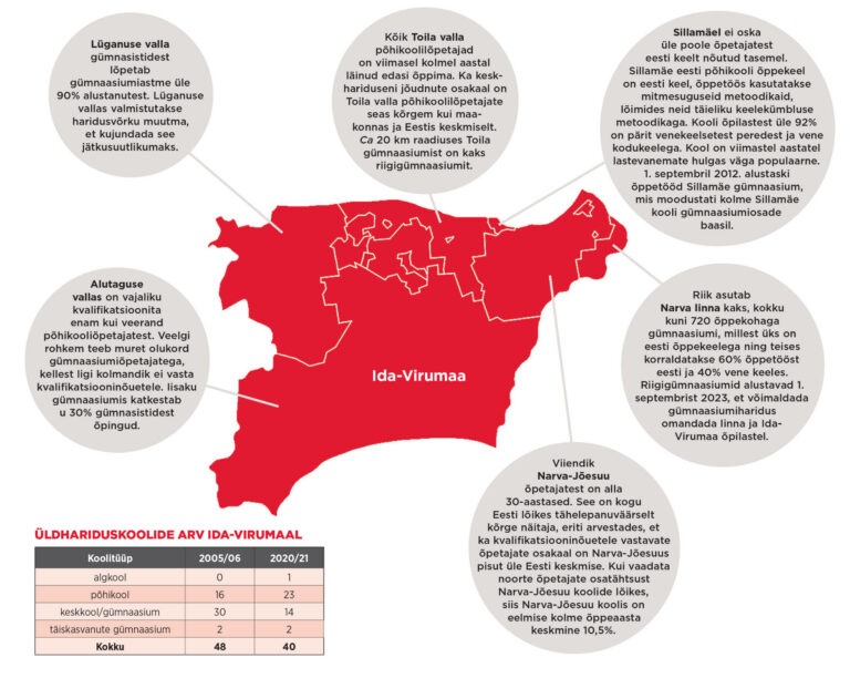 Ida-Virumaa eristub ülejäänud Eestist sellega, et suure osa põhikooliõpetajate riigikeeleoskuse tase ei vasta nõuetele. See muudab paljudele keeruliseks haridustee jätkamise gümnaasiumis. Mida on olukorra parandamiseks tehtud, mis teoksil?