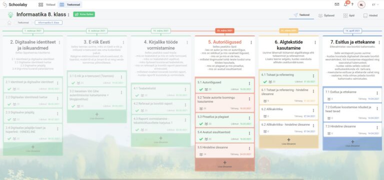 Õpetaja Välile ja tema õpilastele meeldib, et Schoolaby platvormil paigutatakse kõik õpitavad teemad ühele pikale ajateljele. See on väga ülevaatlik. Kursuse jooksul õpitavad peatükid, mida nimetatakse verstapostideks, paiknevad sellel pikal ajateljel. Õpetaja saab neid verstaposte kursuse käigus juurde lisada või vajadusel õppija vaatest peita.