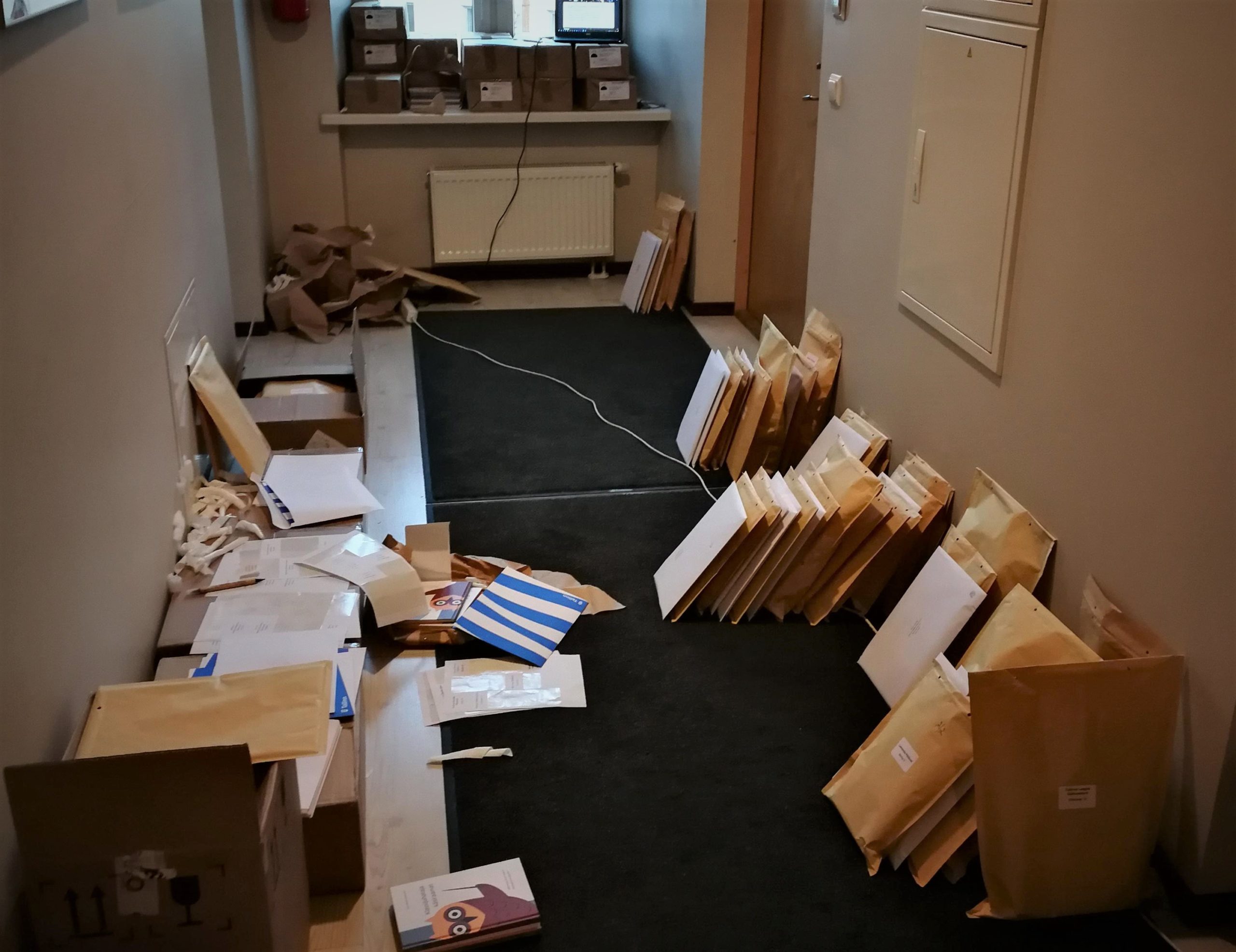 Sajandal tööpäeval saatis haridusamet alustavatele klassijuhatajatele kingituspakid, mis fotol ootavad veel laialisaatmist.