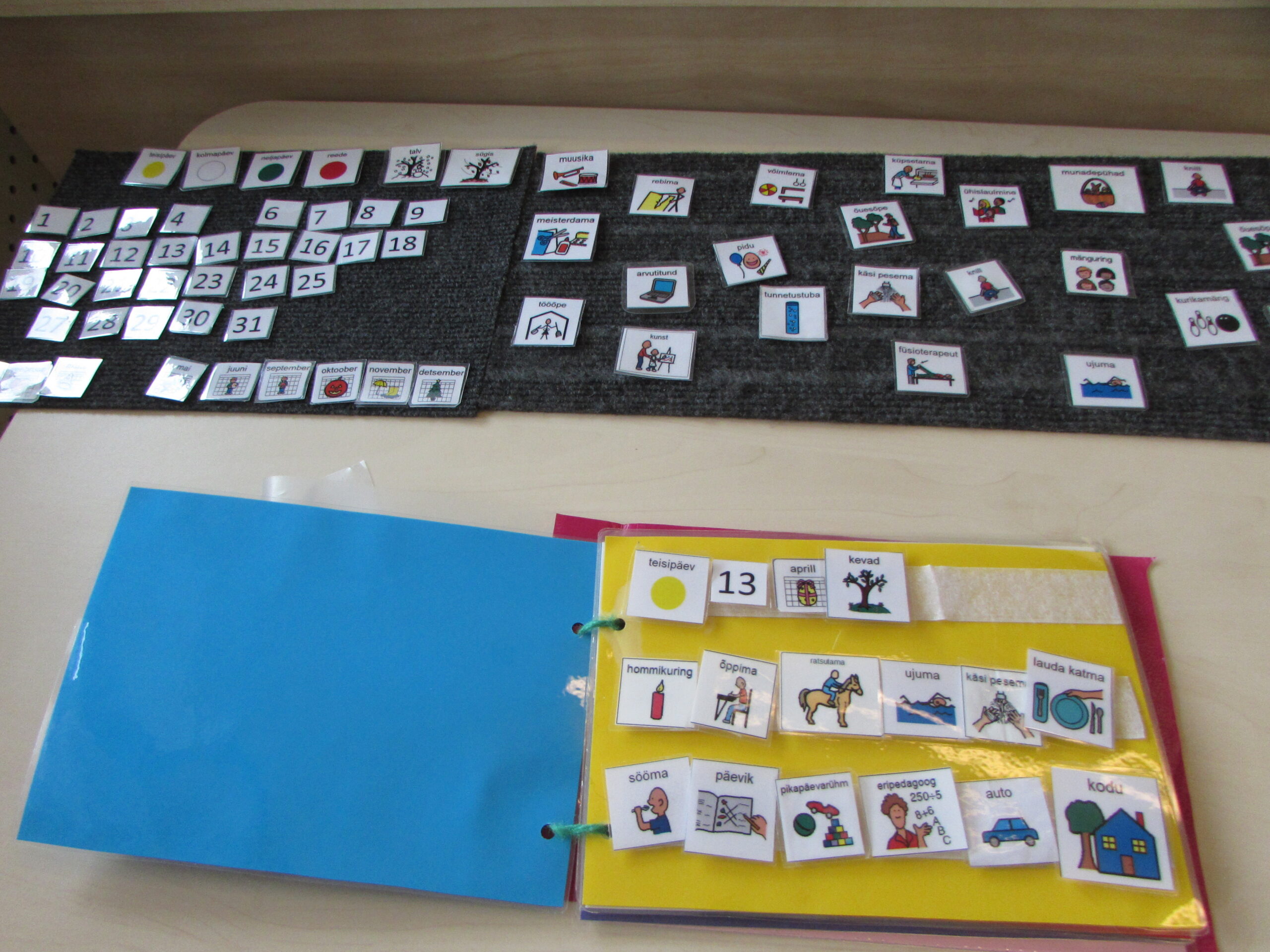 Tahvlil on kogu päevaplaan PCS-piltidena reas: hommikuring – õppima – arvutitundi – võimlema – õue – pikapäevarühma – muusikateraapiasse. Hommikul kooli tulles panevad lapsed ise päevaplaani paika, et nad teaksid, mis ees ootab. Pärast hommikuringi istubki tüdruk oma laua taha ja hakkab õppima ehk töövihikut täitma.