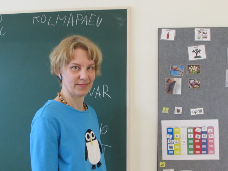 „Seda on ka varem juhtunud, aga meil ei ole kiiret, ootaminegi on meie töö. Näiteks riidessepanekuks võib kuluda aega viiest minutist tunnini. Iga päev on erinev ja palju sõltub tujust, eks ka külaline mõjutab,“ selgitab Krisli Tammela. Kui ta praegu alla annaks, tahakski tüdruk edaspidi tema toolil istuda. „Palun too oma tool, meil algab hommikuring, kui hommikuringis on hästi, siis on arvutitund,“ ütleb õpetaja juba nõudlikumalt.